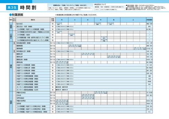 月火水木金土※ご都合にあわせてご視聴ください※ご都合にあわせてご視聴ください※ご都合にあわせてご視聴ください※ご都合にあわせてご視聴ください※ご都合にあわせてご視聴ください※ご都合にあわせてご視聴ください映像講師中村・中土居松本吉見佐々木(洋)河合加賀・佐藤小野・山家●出願書類対策(必須受講)●面接対策(選択制)●小論文対策(選択制)●【プレミアム】過去問対策(選択制)●慶大対策<(法)FITA方式/(法)FITB方式/(文)自主応募制推薦>ー授業分数90909015015090ー【4月開講】共通テスト対策地理(映像)【4月開講】共通テスト対策地理総合(映像)【4月開講】共通テスト対策公共(映像)【4月開講】共通テスト対策倫理(映像)【4月開講】共通テスト対策政治・経済(映像)【4月開講】共通テスト対策情報Ⅰ(映像)総合型・学校推薦型選抜対策プログラム----地歴公民情報総合秋葉原教科申込区分講座名5ページ●2026年度/51/東日本/秋葉原/高3・卒生/パターン6617/2026_51_3_368_11_20250817180902.csv1校了時削除麹町新宿池袋秋葉原自由が丘吉祥寺調布立川町田厚木藤沢あざみ野金沢文庫横浜津田沼柏千葉大宮南浦和川越水戸高3生