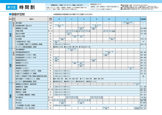 月火水木金土17:10〜18:40脇坂17:10〜18:40中塚17:10〜18:40飛田1月〜)18:10〜19:401月〜)17:00〜19:40中野(喜)19:10〜20:40宮元19:10〜20:40伊藤(し)伊藤1月〜)20:10〜21:404月〜)19:00〜21:40杉山1月〜)18:20〜19:504月〜)17:10〜19:50小竹1月〜)18:10〜19:404月〜)17:00〜19:40西尾(源)1月〜)19:10〜20:404月〜)18:00〜20:40竹内1月〜)17:20〜18:504月〜)16:10〜18:50黒川1月〜)18:10〜19:404月〜)17:00〜19:40加藤映像講師近藤・菅井重盛・松浦野村福永・伊藤(さ)・江ーーーー木村・小野渡部・坂本佐々木(哲)・木村大髙・小松寺田・青野中村・小松向井(亮)・三浦牧島・西尾(健)乾・大學安達・西尾(源)唐牛・長井田島・松永加藤本瀬野黒美松永ーー大内・坂本(勝)田中・西川坂本(新)・沼田平尾(雅)・平松中垣・宮本大野・山口井上※ご都合にあわせてご視聴ください17:10〜18:40隼坂※ご都合にあわせてご視聴ください※ご都合にあわせてご視聴ください授業分数909090909090909090/150※ご都合にあわせてご視聴ください90/15090/15090/150※ご都合にあわせてご視聴ください90/15090/15090/1501月〜)20:10〜21:404月〜)19:00〜21:40三浦90/150※ご都合にあわせてご視聴ください90909090909090909090※ご都合にあわせてご視聴ください※ご都合にあわせてご視聴ください※ご都合にあわせてご視聴ください※ご都合にあわせてご視聴ください※ご都合にあわせてご視聴ください※ご都合にあわせてご視聴ください※ご都合にあわせてご視聴ください※ご都合にあわせてご視聴ください●難関物理●標準物理●難関化学●標準化学90/15090/15090/15090/1501月〜)19:00〜20:304月〜)19:00〜21:40永井909090※ご都合にあわせてご視聴ください※ご都合にあわせてご視聴ください※ご都合にあわせてご視聴ください標準古文(映像)私大古文漢文文法・句形(映像)【4月開講】共通テスト対策国語(映像)【4月開講】社会科学系小論文-早慶国公立大対応【4月開講】小論文【4月開講】看護・保健・歯学系小論文(オンライン授業)【4月開講】自然科学系小論文(オンライン授業)特別選抜物理(映像)難関物理標準物理特別選抜化学(映像)難関化学標準化学難関生物標準生物(映像)共通テスト対策物理(映像)共通テスト対策化学(映像)共通テスト対策生物(映像)共通テスト対策地学(映像)共通テスト対策物理基礎(映像)共通テスト対策化学基礎(映像)共通テスト対策生物基礎(映像)共通テスト対策地学基礎(映像)オンライン個別指導講座(物理)オンライン個別指導講座(化学)早慶大日本史日本史早慶大世界史世界史【4月開講】共通テスト対策日本史(映像)【4月開講】共通テスト対策世界史(映像)【4月開講】共通テスト対策歴史総合(映像)--認定制-認定制-国語小論文理科-地歴自由が丘教科申込区分講座名3ページ●2026年度/51/東日本/自由が丘/高3・卒生/パターン6617/2026_51_3_337_11_20250817180902.csv校了時削除麹町新宿池袋秋葉原自由が丘吉祥寺調布立川町田厚木藤沢あざみ野金沢文庫横浜津田沼柏千葉大宮南浦和川越水戸高3生