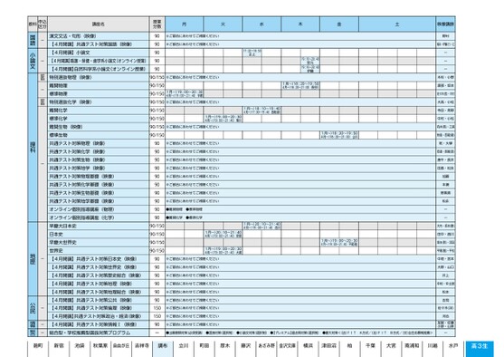 17:20〜18:50高山18:00〜19:30幸長17:10〜19:50森(千)18:00〜20:40墺1月〜)18:20〜19:504月〜)17:10〜19:50髙橋(慶)20:10〜21:40髙橋(慶)18:00〜20:40山本20:10〜21:4020:10〜21:40田中(久)1月〜)18:20〜19:504月〜)17:10〜19:50仲野17:20〜18:50高木17:20〜18:50日髙19:20〜20:50高木※ご都合にあわせてご視聴ください●難関国公立大英語●国公立大英語●私大英語●入試頻出英文法・語法16:10〜18:50山本18:00〜20:40伊東(敦)19:00〜21:40長野18:00〜20:40木下17:20〜18:50高梨(大)17:20〜18:50伊東(敦)17:10〜18:40長野20:00〜21:30古谷17:20〜18:50今田17:20〜18:50永島20:00〜21:30流川18:00〜19:30古谷※ご都合にあわせてご視聴ください※ご都合にあわせてご視聴ください●数列(難関/標準)●微分・積分(難関/標準)●ベクトル(難関/標準)●確率(難関/標準)●難関理系数学ⅢC●難関数学ⅠAⅡBC●標準理系数学ⅢC●標準数学ⅠAⅡBC※ご都合にあわせてご視聴ください17:20〜18:50藤澤17:10〜18:40相川17:20〜18:50伊藤(武)90/150※ご都合にあわせてご視聴ください9060※ご都合にあわせてご視聴ください※ご都合にあわせてご視聴ください90/1501月〜)19:00〜20:304月〜)19:00〜21:40大窪ーーー佐野・胡摩﨑柴田(卓)・髙橋(慶)安井・近藤ー吉川(量)・大島小林柴田(祐)・守屋ーーー樋原・須藤秦野・堀尾秦野・堀尾依田・山本樋原・宮田高梨(大)・波平秦野・永島森本・清水森本・清水湘田ーーーー井上・佐藤山村・坂下藤川・西川山村・坂下藤川・西川一瀬・菱山時間割授業形式は、「対面」「オンライン」「映像」があります。「対面」「オンライン(集団)」:授業曜日・時間帯は、以下の時間割をご確認ください。「オンライン(個別)」「映像」:ご都合にあわせてご受講ください。*申込区分について認定制「認定(受講資格)」の取得が必要な講座です。ーどなたでも受講できる講座です。●受験対策講座(映像)のみのお申し込みはできません。受験対策講座(対面/オンライン)と組み合わせて、お申し込みください。●同一名称の講座は設置校舎・曜日・時間帯・授業形式が異なっても同一内容です。●担当講師は変更になる場合があります。あらかじめご了承ください。※映像授業は対面授業以外の曜日でもご受講いただけます。月火水木金土師講像映授業分数1501501509090/1509090909090901501501509090909090909090909090909090東大英語医進英語特別選抜英語-国公立大難関国公立大英語早慶大英語国公立大英語GMARCH英語私大英語入試頻出英文法・語法【4月開講】共通テスト対策英語(映像)オンライン個別指導講座(英語)東大理類数学医進数学特別選抜理系数学ⅢC特別選抜数学ⅠAⅡBC-理系特別選抜数学ⅠAⅡBC-文系難関理系数学ⅢC難関数学ⅠAⅡBC標準理系数学ⅢC標準数学ⅠAⅡBC【4月開講】共通テスト対策数学ⅠAⅡBC共通テスト対策数学ⅠA(映像)共通テスト対策数学C「平面上の曲線と複素数平面」映像)数学重要テーマ対策ユニット(映像)オンライン個別指導講座(数学)難関国公立大現代文(論述対策)難関国公立大古文(論述対策)難関現代文(映像)難関古典(映像)難関古文(映像)【4月開講】難関漢文(映像)早大現代文認定制-認定制-英語数学-国語教科申込区分講座名高3生立川●立川校1ページ●2026年度/51/東日本/立川/高3・卒生/パターン6617/2026_51_3_315_11_20250817185653.csv校了時削除