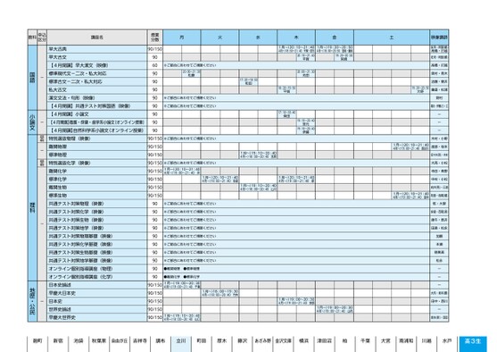 高3生時間割授業形式は、「対面」「オンライン」「映像」があります。「対面」「オンライン(集団)」:授業曜日・時間帯は、以下の時間割をご確認ください。「オンライン(個別)」「映像」:ご都合にあわせてご受講ください。*申込区分について認定制「認定(受講資格)」の取得が必要な講座です。ーどなたでも受講できる講座です。●受験対策講座(映像)のみのお申し込みはできません。受験対策講座(対面/オンライン)と組み合わせて、お申し込みください。●同一名称の講座は設置校舎・曜日・時間帯・授業形式が異なっても同一内容です。●担当講師は変更になる場合があります。あらかじめご了承ください。立川●立川校※映像授業は対面授業以外の曜日でもご受講いただけます。月火水木金土1月〜)16:10〜17:404月〜)16:10〜18:50永井19:50〜21:20佐々木(洋)※ご都合にあわせてご視聴ください※ご都合にあわせてご視聴ください※ご都合にあわせてご視聴ください※ご都合にあわせてご視聴ください※ご都合にあわせてご視聴ください※ご都合にあわせてご視聴ください※ご都合にあわせてご視聴ください※ご都合にあわせてご視聴ください※ご都合にあわせてご視聴ください映像講師平尾(雅)・平松ー中垣・宮本大野・山口井上中村・中土居松本吉見佐々木(洋)河合加賀・佐藤竹内・山家●出願書類対策(必須受講)●面接対策(選択制)●小論文対策(選択制)●【プレミアム】過去問対策(選択制)●慶大対策<(法)FITA方式/(法)FITB方式/(文)自主応募制推薦>ー授業分数90/1509090909090909015015090ー世界史政治・経済【4月開講】共通テスト対策日本史(映像)【4月開講】共通テスト対策世界史(映像)【4月開講】共通テスト対策歴史総合(映像)【4月開講】共通テスト対策地理(映像)【4月開講】共通テスト対策地理総合(映像)【4月開講】共通テスト対策公共(映像)【4月開講】共通テスト対策倫理(映像)【4月開講】共通テスト対策政治・経済(映像)【4月開講】共通テスト対策情報Ⅰ(映像)総合型・学校推薦型選抜対策プログラム-地歴・公民--情報総合教科申込区分講座名5ページ●2026年度/51/東日本/立川/高3・卒生/パターン6617/2026_51_3_315_11_20250817185653.csv校了時削除