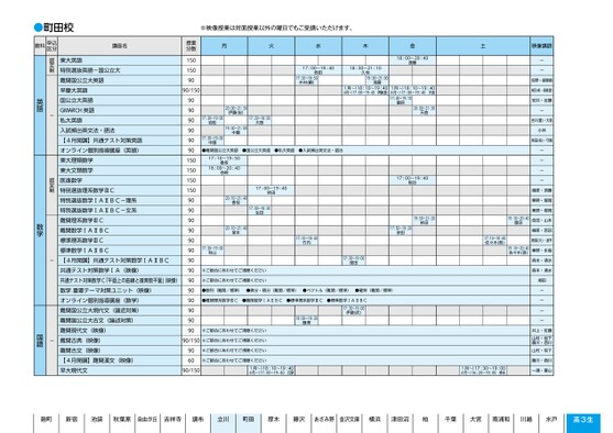 時間割授業形式は、「対面」「オンライン」「映像」があります。「対面」「オンライン(集団)」:授業曜日・時間帯は、以下の時間割をご確認ください。「オンライン(個別)」「映像」:ご都合にあわせてご受講ください。*申込区分について認定制「認定(受講資格)」の取得が必要な講座です。ーどなたでも受講できる講座です。●受験対策講座(映像)のみのお申し込みはできません。受験対策講座(対面/オンライン)と組み合わせて、お申し込みください。●同一名称の講座は設置校舎・曜日・時間帯・授業形式が異なっても同一内容です。●担当講師は変更になる場合があります。あらかじめご了承ください。※映像授業は対面授業以外の曜日でもご受講いただけます。月火水木金土1月〜)18:30〜20:004月〜)18:30〜21:20阿部(順)・喜久里18:30〜20:00阿部(順)1月〜)17:30〜19:004月〜)17:30〜20:2宮崎・打越17:30〜19:000宮崎※ご都合にあわせてご視聴ください※ご都合にあわせてご視聴ください20:00〜21:30喜久里17:40〜19:10中林19:30〜21:0019:20〜20:50宮崎打越19:10〜20:4019:10〜20:40宮元伊藤17:30〜19:00松崎17:10〜18:40太田19:20〜20:50本間・税田1月〜)18:10〜19:404月〜)17:00〜19:40佐々木(哲)1月〜)20:10〜21:404月〜)19:00〜21:40井上90/150※ご都合にあわせてご視聴ください90/15090/15090/150※ご都合にあわせてご視聴ください90/15090/15090/15090/1509090909090909090909090/15090/15090/15090/150901月〜)18:10〜19:404月〜)17:00〜19:40安達1月〜)20:10〜21:404月〜)19:00〜21:40早川1月〜)20:10〜21:404月〜)19:00〜21:40永井1月〜)20:00〜21:304月〜)18:50〜21:30唐牛1月〜)20:00〜21:304月〜)18:50〜21:30牧島※ご都合にあわせてご視聴ください※ご都合にあわせてご視聴ください※ご都合にあわせてご視聴ください※ご都合にあわせてご視聴ください※ご都合にあわせてご視聴ください※ご都合にあわせてご視聴ください※ご都合にあわせてご視聴ください※ご都合にあわせてご視聴ください●難関物理●標準物理●難関化学●標準化学1月〜)20:00〜21:304月〜)18:50〜21:30安部1月〜)19:00〜20:30黒川4月〜)19:00〜21:401月〜)19:00〜20:304月〜)19:00〜21:40佐々木(尊)1月〜)19:00〜20:30桐山4月〜)19:00〜21:4019:30〜21:00平尾(則)師講像映佐河・阿部(順)髙橋・打越佐河・阿部(順)髙橋・打越奥村・青木近藤・菅井重盛・松浦野村福永・伊藤(さ)・江ーーー木村・小野渡部・坂本佐々木(哲)・木村大髙・小松寺田・青野中村・小松向井(亮)・三浦牧島・西尾(健)乾・大學安達・西尾(源)唐牛・長井田島・松永加藤本瀬野黒美松永ーー大内・坂本(勝)田中・西川坂本(新)・沼田平尾(雅)・平松ー授業分数90/15090609090909090909090講座名早大古典早大古文【4月開講】早大漢文(映像)標準現代文-二次・私大対応標準古文(映像)私大古文漢文文法・句形【4月開講】共通テスト対策国語【4月開講】小論文【4月開講】看護・保健・歯学系小論文(オンライン授業)【4月開講】自然科学系小論文(オンライン授業)特別選抜物理(映像)難関物理標準物理特別選抜化学(映像)難関化学標準化学難関生物標準生物共通テスト対策物理(映像)共通テスト対策化学(映像)共通テスト対策生物(映像)共通テスト対策地学(映像)共通テスト対策物理基礎(映像)共通テスト対策化学基礎(映像)共通テスト対策生物基礎(映像)共通テスト対策地学基礎(映像)オンライン個別指導講座(物理)オンライン個別指導講座(化学)早慶大日本史日本史早慶大世界史世界史政治・経済教科申込区分-国語-認定制-認定制-小論文理科-地歴・公民高3生町田●町田校3ページ●2026年度/51/東日本/町田/高3・卒生/パターン6617/2026_51_3_325_11_20250817185653.csv校了時削除