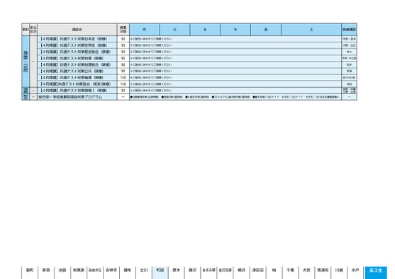 高3生時間割授業形式は、「対面」「オンライン」「映像」があります。「対面」「オンライン(集団)」:授業曜日・時間帯は、以下の時間割をご確認ください。「オンライン(個別)」「映像」:ご都合にあわせてご受講ください。*申込区分について認定制「認定(受講資格)」の取得が必要な講座です。ーどなたでも受講できる講座です。●受験対策講座(映像)のみのお申し込みはできません。受験対策講座(対面/オンライン)と組み合わせて、お申し込みください。●同一名称の講座は設置校舎・曜日・時間帯・授業形式が異なっても同一内容です。●担当講師は変更になる場合があります。あらかじめご了承ください。※映像授業は対面授業以外の曜日でもご受講いただけます。授業分数15090月火水19:00〜21:40大胡90/1501月〜)20:00〜21:304月〜)19:00〜21:40奈良岡木金土1月〜)19:30〜21:004月〜)18:20〜21:00伊藤(宏)18:00〜19:30犬塚17:20〜18:50大島19:20〜20:50東内映像講師ー佐野・胡摩﨑柴田(卓)・髙橋(慶)安井・近藤ー19:20〜20:50水野吉川(量)・大島18:00〜19:30木村(麟)17:30〜19:00岡本※ご都合にあわせてご視聴ください●難関国公立大英語●国公立大英語●私大英語●入試頻出英文法・語法19:00〜21:40中谷19:20〜20:50岩村17:20〜18:50富田17:20〜18:50堀尾19:20〜20:50富田18:00〜19:30古谷17:20〜18:50高田17:20〜18:50川口17:20〜18:50岩村※ご都合にあわせてご視聴ください※ご都合にあわせてご視聴ください※ご都合にあわせてご視聴ください●数列(難関/標準)●微分・積分(難関/標準)●ベクトル(難関/標準)●確率(難関/標準)●難関理系数学ⅢC●難関数学ⅠAⅡBC●標準理系数学ⅢC●標準数学ⅠAⅡBC1月〜)17:30〜19:004月〜)17:30〜20:20越野・伊藤(恭)17:30〜19:00越野1月〜)19:20〜20:504月〜)18:00〜20:50山下・伊藤(恭)(恭)下月100〜5019:20〜20:50山下1月〜)18:20〜19:504月〜)17:10〜19:50森永1月〜)19:10〜20:404月〜)17:50〜20:40渡部・喜久里喜月1750〜20019:10〜20:40渡部20:10〜21:40森永17:10〜18:40渡部17:30〜19:00山下※ご都合にあわせてご視聴ください※ご都合にあわせてご視聴ください※ご都合にあわせてご視聴ください※ご都合にあわせてご視聴ください※ご都合にあわせてご視聴ください17:30〜19:00佐々木(夫)17:30〜19:00絵川小林柴田(祐)・守屋ー樋原・須藤秦野・堀尾依田・山本樋原・宮田高梨(大)・波平秦野・永島森本・清水森本・清水湘田ーー井上・佐藤山村・坂下藤川・西川山村・坂下藤川・西川一瀬・菱山佐河・阿部(順)髙橋・打越佐河・阿部(順)髙橋・打越奥村・青木近藤・菅井重盛・松浦野村福永・伊藤(さ)・江909090909090150909090909090909090909090/150906090/15090/15090609090909090講座名特別選抜英語-国公立大難関国公立大英語早慶大英語国公立大英語GMARCH英語私大英語入試頻出英文法・語法【4月開講】共通テスト対策英語(映像)オンライン個別指導講座(英語)特別選抜理系数学ⅢC特別選抜数学ⅠAⅡBC-文系難関理系数学ⅢC難関数学ⅠAⅡBC標準理系数学ⅢC標準数学ⅠAⅡBC共通テスト対策数学ⅠAⅡBC(映像)共通テスト対策数学ⅠA(映像)共通テスト対策数学C「平面上の曲線と複素数平面」映像)数学重要テーマ対策ユニット(映像)オンライン個別指導講座(数学)難関現代文-二次・私大対応難関古典-二次・私大対応難関古文-二次・私大対応【4月開講】難関漢文(映像)早大現代文早大古典早大古文【4月開講】早大漢文(映像)標準現代文-二次・私大対応標準古文(映像)私大古文漢文文法・句形(映像)【4月開講】共通テスト対策国語(映像)認定制教科申込区分-英語認定制-数学-国語厚木厚木●厚木現役館1ページ●2026年度/51/東日本/厚木/高3・卒生/パターン6617/2026_51_3_332_11_20250817180902.csv校了時削除3ペ