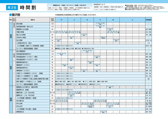 授業分数90909090909090月火水木金土※ご都合にあわせてご視聴ください※ご都合にあわせてご視聴ください※ご都合にあわせてご視聴ください17:10〜18:40柴田17:10〜18:40福田18:00〜19:30阿部(順)19:10〜20:40宮元19:10〜20:40伊藤(し)藤90/150※ご都合にあわせてご視聴ください90/15090/15090/150※ご都合にあわせてご視聴ください90/15090/15090/150※ご都合にあわせてご視聴ください1月〜)18:20〜19:504月〜)17:10〜19:50安達1月〜)19:00〜20:304月〜)19:00〜21:40佐々木(哲)1月〜)19:00〜20:304月〜)19:00〜21:40早川1月〜)17:10〜18:404月〜)16:00〜18:40井上90/1509090909090909090909090/15090/15090/15090/1501月〜)19:00〜20:304月〜)19:00〜21:40岡※ご都合にあわせてご視聴ください※ご都合にあわせてご視聴ください※ご都合にあわせてご視聴ください※ご都合にあわせてご視聴ください※ご都合にあわせてご視聴ください※ご都合にあわせてご視聴ください※ご都合にあわせてご視聴ください※ご都合にあわせてご視聴ください●難関物理●標準物理●難関化学●標準化学1月〜)18:10〜19:404月〜)17:00〜19:40依田1月〜)19:00〜20:304月〜)19:00〜21:40黒川1月〜)19:00〜20:304月〜)19:00〜21:40斉藤1月〜)17:10〜18:404月〜)16:00〜18:40平尾(雅)90909090※ご都合にあわせてご視聴ください※ご都合にあわせてご視聴ください※ご都合にあわせてご視聴ください※ご都合にあわせてご視聴ください映像講師近藤・菅井重盛・松浦野村福永・伊藤(さ)・江ーーー木村・小野渡部・坂本佐々木(哲)・木村大髙・小松寺田・青野中村・小松向井(亮)・三浦牧島・西尾(健)乾・大學安達・西尾(源)唐牛・長井田島・松永加藤本瀬野黒美松永ーー大内・坂本(勝)田中・西川坂本(新)・沼田平尾(雅)・平松中垣・宮本大野・山口井上中村・中土居標準古文(映像)私大古文漢文文法・句形(映像)【4月開講】共通テスト対策国語(映像)【4月開講】小論文【4月開講】看護・保健・歯学系小論文(オンライン授業)【4月開講】自然科学系小論文(オンライン授業)特別選抜物理(映像)難関物理標準物理特別選抜化学(映像)難関化学標準化学難関生物(映像)標準生物共通テスト対策物理(映像)共通テスト対策化学(映像)共通テスト対策生物(映像)共通テスト対策地学(映像)共通テスト対策物理基礎(映像)共通テスト対策化学基礎(映像)共通テスト対策生物基礎(映像)共通テスト対策地学基礎(映像)オンライン個別指導講座(物理)オンライン個別指導講座(化学)早慶大日本史日本史早慶大世界史世界史【4月開講】共通テスト対策日本史(映像)【4月開講】共通テスト対策世界史(映像)【4月開講】共通テスト対策歴史総合(映像)【4月開講】共通テスト対策地理(映像)--認定制-認定制-国語小論文理科-地歴藤沢教科申込区分講座名3ページ●2026年度/51/東日本/藤沢/高3・卒生/パターン6617/2026_51_3_331_11_20250817180902.csv校了時削除麹町新宿池袋秋葉原自由が丘吉祥寺調布立川町田厚木藤沢あざみ野金沢文庫横浜津田沼柏千葉大宮南浦和川越水戸高3生