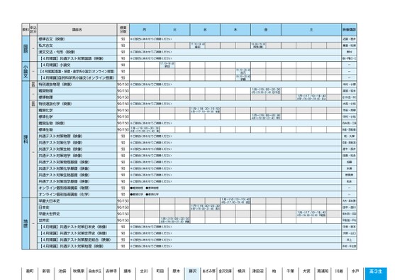 高3生時間割授業形式は、「対面」「オンライン」「映像」があります。「対面」「オンライン(集団)」:授業曜日・時間帯は、以下の時間割をご確認ください。「オンライン(個別)」「映像」:ご都合にあわせてご受講ください。*申込区分について認定制「認定(受講資格)」の取得が必要な講座です。ーどなたでも受講できる講座です。●受験対策講座(映像)のみのお申し込みはできません。受験対策講座(対面/オンライン)と組み合わせて、お申し込みください。●同一名称の講座は設置校舎・曜日・時間帯・授業形式が異なっても同一内容です。●担当講師は変更になる場合があります。あらかじめご了承ください。藤沢●藤沢館※映像授業は対面授業以外の曜日でもご受講いただけます。月火水木金土※ご都合にあわせてご視聴ください※ご都合にあわせてご視聴ください※ご都合にあわせてご視聴ください※ご都合にあわせてご視聴ください※ご都合にあわせてご視聴ください映像講師松本吉見佐々木(洋)河合加賀・佐藤竹内・山家●出願書類対策(必須受講)●面接対策(選択制)●小論文対策(選択制)●【プレミアム】過去問対策(選択制)●慶大対策<(法)FITA方式/(法)FITB方式/(文)自主応募制推薦>ー授業分数909015015090ー----【4月開講】共通テスト対策地理総合(映像)【4月開講】共通テスト対策公共(映像)【4月開講】共通テスト対策倫理(映像)【4月開講】共通テスト対策政治・経済(映像)【4月開講】共通テスト対策情報Ⅰ(映像)総合型・学校推薦型選抜対策プログラム地歴公民情報総合教科申込区分講座名5ページ●2026年度/51/東日本/藤沢/高3・卒生/パターン6617/2026_51_3_331_11_20250817180902.csv校了時削除