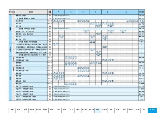 高3生時間割授業形式は、「対面」「オンライン」「映像」があります。「対面」「オンライン(集団)」:授業曜日・時間帯は、以下の時間割をご確認ください。「オンライン(個別)」「映像」:ご都合にあわせてご受講ください。*申込区分について認定制「認定(受講資格)」の取得が必要な講座です。ーどなたでも受講できる講座です。●受験対策講座(映像)のみのお申し込みはできません。受験対策講座(対面/オンライン)と組み合わせて、お申し込みください。●同一名称の講座は設置校舎・曜日・時間帯・授業形式が異なっても同一内容です。●担当講師は変更になる場合があります。あらかじめご了承ください。横浜●横浜校※映像授業は対面授業以外の曜日でもご受講いただけます。月火水木金土1月〜)19:40〜21:104月〜)18:30〜21:10田中1月〜)20:10〜21:404月〜)19:00〜21:40黒川1月〜)18:00〜19:304月〜)18:00〜20:40坂本(新)1月〜)18:50〜20:204月〜)17:40〜20:20斉藤※ご都合にあわせてご視聴ください※ご都合にあわせてご視聴ください●難関物理●標準物理●難関化学●標準化学1月〜)18:00〜19:304月〜)18:00〜20:40竹内1月〜)19:00〜20:304月〜)19:00〜21:40依田1月〜)19:10〜20:404月〜)18:00〜20:40坂本(勝)1月〜)18:20〜19:504月〜)17:10〜19:50大野1月〜)19:10〜20:404月〜)18:00〜20:40沼田1月〜)19:10〜20:404月〜)18:00〜20:40中井1月〜)19:10〜20:404月〜)18:00〜20:40加藤19:20〜20:50平尾(則)※ご都合にあわせてご視聴ください※ご都合にあわせてご視聴ください※ご都合にあわせてご視聴ください※ご都合にあわせてご視聴ください※ご都合にあわせてご視聴ください※ご都合にあわせてご視聴ください※ご都合にあわせてご視聴ください※ご都合にあわせてご視聴ください※ご都合にあわせてご視聴ください映像講師野黒美松永ーーーー大内・坂本(勝)田中・西川ーー坂本(新)・沼田平尾(雅)・平松ーー中垣・宮本大野・山口井上中村・中土居松本吉見佐々木(洋)河合加賀・佐藤竹内・山家●出願書類対策(必須受講)●面接対策(選択制)●小論文対策(選択制)●【プレミアム】過去問対策(選択制)●慶大対策<(法)FITA方式/(法)FITB方式/(文)自主応募制推薦>ー授業分数9090909090/15090/15090/15090/15090/15090/15090/15090/15090/1509090909090909015015090ー講座名共通テスト対策生物基礎(映像)共通テスト対策地学基礎(映像)オンライン個別指導講座(物理)オンライン個別指導講座(化学)東大日本史日本史論述早慶大日本史日本史東大世界史世界史論述早慶大世界史世界史東大地理政治・経済【4月開講】共通テスト対策日本史(映像)【4月開講】共通テスト対策世界史(映像)【4月開講】共通テスト対策歴史総合(映像)【4月開講】共通テスト対策地理(映像)【4月開講】共通テスト対策地理総合(映像)【4月開講】共通テスト対策公共(映像)【4月開講】共通テスト対策倫理(映像)【4月開講】共通テスト対策政治・経済(映像)【4月開講】共通テスト対策情報Ⅰ(映像)総合型・学校推薦型選抜対策プログラム教科申込区分-理科地歴--地歴・公民公民---地歴公民情報総合5ページ●2026年度/51/東日本/横浜/高3・卒生/パターン6617/2026_51_3_321_11_20250817181825.csv校了時削除
