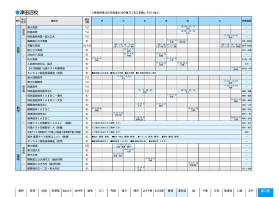 ※映像授業は対面授業以外の曜日でもご受講いただけます。月火水木金土※ご都合にあわせてご視聴ください1月〜)18:30〜20:004月〜)18:30〜21:10山崎※ご都合にあわせてご視聴ください17:30〜19:00松藤※ご都合にあわせてご視聴ください19:30〜21:00川崎17:30〜19:00本間・中17:00〜18:30伊藤1月〜)19:10〜20:404月〜)17:50〜20:40中村19:10〜20:40中村1月〜)18:50〜20:204月〜)18:50〜21:30兵頭1月〜)19:20〜20:5004月〜)18:00〜20:5平賀・酒井(辰)19:20〜20:50平賀17:30〜19:00平賀17:30〜19:00酒井(辰)17:00〜18:30兵頭17:30〜19:00倉橋19:20〜20:50陣野宮元伊藤19:10〜20:4019:10〜20:401月〜)19:10〜20:404月〜)18:00〜20:40鈴木(誠)1月〜)18:20〜19:504月〜)17:10〜19:50佐々木(哲)1月〜)19:30〜21:004月〜)18:20〜21:00宮原1月〜)19:10〜20:404月〜)18:00〜20:40樹葉1月〜)19:40〜21:104月〜)18:30〜21:10合田1月〜)19:50〜21:204月〜)18:40〜21:20寺田1月〜)20:10〜21:404月〜)19:00〜21:40西尾(源)1月〜)20:00〜21:304月〜)18:50〜21:30三浦1月〜)20:00〜21:304月〜)18:50〜21:30田中※ご都合にあわせてご視聴ください※ご都合にあわせてご視聴ください※ご都合にあわせてご視聴ください※ご都合にあわせてご視聴ください※ご都合にあわせてご視聴ください※ご都合にあわせてご視聴ください※ご都合にあわせてご視聴ください1月〜)20:00〜21:3004月〜)18:0〜21:3川崎・酒井(辰)20:00〜21:30川崎19:30〜21:00阿部(順)1月〜)19:40〜21:104月〜)18:30〜21:10古川1月〜)17:20〜18:504月〜)16:10〜18:50鈴木(翔)師講像映山村・坂下藤川・西川山村・坂下藤川・西川一瀬・菱山佐河・阿部(順)髙橋・打越佐河・阿部(順)髙橋・打越奥村・青木近藤・菅井重盛・松浦野村福永・伊藤(さ)・江ーーーーー木村・小野渡部・坂本渡部・坂本佐々木(哲)・木村大髙・小松寺田・青野寺田・青野中村・小松向井(亮)・三浦牧島・西尾(健)乾・大學安達・西尾(源)唐牛・長井田島・松永加藤本瀬野黒美授業形式は、「対面」「オンライン」「映像」があります。「対面」「オンライン(集団)」:授業曜日・時間帯は、以下の時間割をご確認ください。「オンライン(個別)」「映像」:ご都合にあわせてご受講ください。*申込区分について認定制「認定(受講資格)」の取得が必要な講座です。ーどなたでも受講できる講座です。●受験対策講座(映像)のみのお申し込みはできません。受験対策講座(対面/オンライン)と組み合わせて、お申し込みください。●同一名称の講座は設置校舎・曜日・時間帯・授業形式が異なっても同一内容です。●担当講師は変更になる場合があります。あらかじめご了承ください。授業分数90/150906090/15090/15090609090909090909090909090/15090/15090/15090/15090/15090/15090/15090/15090/15090/15090909090909090難関古典-二次・私大対応難関古文-二次・私大対応【4月開講】難関漢文(映像)早大現代文早大古典早大古文【4月開講】早大漢文(映像)標準現代文-二次・私大対応標準古文(映像)私大古文漢文文法・句形【4月開講】共通テスト対策国語【4月開講】医系小論文【4月開講】社会科学系小論文-早慶国公立大対応【4月開講】小論文【4月開講】看護・保健・歯学系小論文(オンライン授業)【4月開講】自然科学系小論文(オンライン授業)特別選抜物理難関物理難関物理-医進標準物理特別選抜化学難関化学難関化学-医進標準化学難関生物標準生物共通テスト対策物理(映像)共通テスト対策化学(映像)共通テスト対策生物(映像)共通テスト対策地学(映像)共通テスト対策物理基礎(映像)共通テスト対策化学基礎(映像)共通テスト対策生物基礎(映像)-国語-認定制-認定制-小論文理科教科申込区分講座名高3生時間割津田沼●津田沼校3ページ●2026年度/51/東日本/津田沼/高3・卒生/パターン6617/2026_51_3_327_11_20250817185653.csv校了時削除