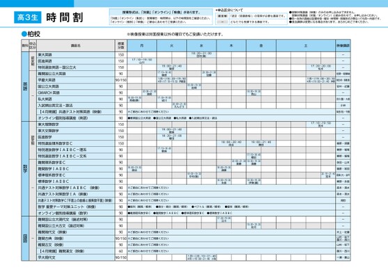 月火水木金土1月〜)18:00〜19:304月〜)18:00〜20:50隼坂・宮本18:00〜19:30隼坂20:00〜21:30荒田17:10〜18:40田中17:20〜18:50清水(唯)1月〜)20:10〜21:404月〜)19:00〜21:40加藤19:10〜20:40宮元19:10〜20:40伊藤(し)映像講師佐河・阿部(順)髙橋・打越佐河・阿部(順)髙橋・打越奥村・青木近藤・菅井重盛・松浦野村福永・伊藤(さ)・江ーーーー木村・小野渡部・坂本佐々木(哲)・木村大髙・小松寺田・青野寺田・青野中村・小松向井(亮)・三浦牧島・西尾(健)乾・大學安達・西尾(源)唐牛・長井田島・松永加藤本瀬野黒美松永ーーー大内・坂本(勝)※ご都合にあわせてご視聴ください※ご都合にあわせてご視聴ください※ご都合にあわせてご視聴ください20:00〜21:30川崎18:00〜19:30松藤18:00〜19:30中17:00〜18:30宮元90/150※ご都合にあわせてご視聴ください1月〜)20:10〜21:404月〜)19:00〜21:40中野(喜)90/15090/15090/150※ご都合にあわせてご視聴ください1月〜)19:10〜20:40沖4月〜)18:00〜20:401月〜)19:30〜21:004月〜)18:20〜21:00向井(勇)1月〜)20:10〜21:404月〜)19:00〜21:40原90/15090/15090/15090/15090/1501月〜)19:10〜20:404月〜)18:00〜20:40浅利1月〜)20:10〜21:40倉田4月〜)19:00〜21:401月〜)20:10〜21:404月〜)19:00〜21:40三浦90909090909090909090※ご都合にあわせてご視聴ください※ご都合にあわせてご視聴ください※ご都合にあわせてご視聴ください※ご都合にあわせてご視聴ください※ご都合にあわせてご視聴ください※ご都合にあわせてご視聴ください※ご都合にあわせてご視聴ください※ご都合にあわせてご視聴ください●難関物理●標準物理●難関化学●標準化学90/15090/1501月〜)20:10〜21:404月〜)19:00〜21:40大内1月〜)19:10〜20:404月〜)18:00〜20:40舩倉授業分数90/1509060909090909090909090講座名早大古典早大古文【4月開講】早大漢文(映像)標準現代文-二次・私大対応標準古文-二次・私大対応私大古文漢文文法・句形(映像)【4月開講】共通テスト対策国語(映像)【4月開講】医系小論文【4月開講】小論文【4月開講】看護・保健・歯学系小論文(オンライン授業)【4月開講】自然科学系小論文(オンライン授業)特別選抜物理(映像)難関物理標準物理特別選抜化学(映像)難関化学難関化学-医進標準化学難関生物-医進標準生物共通テスト対策物理(映像)共通テスト対策化学(映像)共通テスト対策生物(映像)共通テスト対策地学(映像)共通テスト対策物理基礎(映像)共通テスト対策化学基礎(映像)共通テスト対策生物基礎(映像)共通テスト対策地学基礎(映像)オンライン個別指導講座(物理)オンライン個別指導講座(化学)日本史論述早慶大日本史科申込区分柏教-国語-認定制-認定制-小論文理科-地歴3ページ●2026年度/51/東日本/柏/高3・卒生/パターン6617/2026_51_3_322_11_20250817180902.csv2校了時削除麹町新宿池袋秋葉原自由が丘吉祥寺調布立川町田厚木藤沢あざみ野金沢文庫横浜津田沼柏千葉大宮南浦和川越水戸高3生