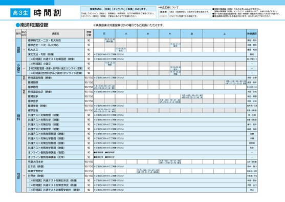 月火水木金土※ご都合にあわせてご視聴ください※ご都合にあわせてご視聴ください※ご都合にあわせてご視聴ください※ご都合にあわせてご視聴ください※ご都合にあわせてご視聴ください※ご都合にあわせてご視聴ください映像講師中村・中土居松本吉見佐々木(洋)河合加賀・佐藤小野竹・山家●出願書類対策(必須受講)●面接対策(選択制)●小論文対策(選択制)●【プレミアム】過去問対策(選択制)●慶大対策<(法)FITA方式/(法)FITB方式/(文)自主応募制推薦>ー授業分数90909015015090ー【4月開講】共通テスト対策地理(映像)【4月開講】共通テスト対策地理総合(映像)【4月開講】共通テスト対策公共(映像)【4月開講】共通テスト対策倫理(映像)【4月開講】共通テスト対策政治・経済(映像)【4月開講】共通テスト対策情報Ⅰ(映像)総合型・学校推薦型選抜対策プログラム----地歴公民情報総合南浦和教科申込区分講座名5ページ●2026年度/51/東日本/南浦和/高3・卒生/パターン6617/2026_51_3_336_11_20250817180902.csv1校了時削除麹町新宿池袋秋葉原自由が丘吉祥寺調布立川町田厚木藤沢あざみ野金沢文庫横浜津田沼柏千葉大宮南浦和川越水戸高3生