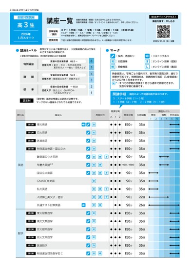 ※2026年4月から高3生の方対象受験対策講座高3生2026年1月スタート講座一覧受験対策講座(映像)のみのお申し込みはできません。受験対策講座(対面/オンライン)と組み合わせて、お申し込みください。Webサイトへアクセス!講座を探す・申し込む授業学期/講数授業時間スタート学期:9講、1学期:13講、2学期:13講〈年間35講〉※スタート学期:1〜3月/1学期:4〜7月/2学期:9〜12月※一部講座を除く。授業日程は69・70ページをご確認ください。下記に記載の授業時間に休憩時間は含みません。※一部講座には途中休憩があります。2025/11/6(木)公開●講座レベル数字が大きいほど難度が高く、入試難易度の高い大学をめざす方向けの講座です。※受講の目安偏差値は、河合塾全統模試における偏差値特別選抜受講の目安偏差値65.0〜目標大学:東大・京大・医学部医学科東京科学大・一橋大・旧帝大など難関受講の目安偏差値55.0〜目標大学:難関国公立大・早慶大など標準受講の目安偏差値〜55.0目標大学:国公立大・GMARCH・その他私立大など認定制「認定制」講座の受講には認定が必要です。マークのない講座はどなたでも受講できます。654321●マーク:採点・添削あり:リスニングあり:対面授業:映像授業:オンライン授業(個別):オンライン授業(集団)映像授業は、学期ごとの提供です。各学期の開講以降、通年で視聴が可能です。視聴期間は、受講開始可能日(入金確認後)から2027年3月末までです。:すべての学期の授業を1月から通年で視聴できます。先取り学習に最適です。★開講学期講座によって開講時期が異なります。ス:スタート学期(1〜3月)1:1学期(4〜7月)2:2学期(9〜12月)教科名講座名授業形式認定制東大英語認定制京大英語認定制医進英語認定制特別選抜英語-国公立大難関国公立大英語英語早慶大英語※1国公立大英語GMARCH英語私大英語入試頻出英文法・語法共通テスト対策英語認定制東大理類数学認定制東大文類数学数学認定制京大理系数学認定制京大文系数学認定制医進数学認定制特別選抜理系数学ⅢC授業時間年間講数標準難関1234特別選抜56講座レベル開講学期ス12●●●●●●●●●●●●●●●150分150分150分150分90分35講35講35講35講35講35講35講35講35講22講26講35講35講35講35講35講35講●●●90分/150分●●●●●●●●●●●●●●●●●●●●●●●●●●●●●●●90分90分90分90分90分150分150分150分150分150分150分
