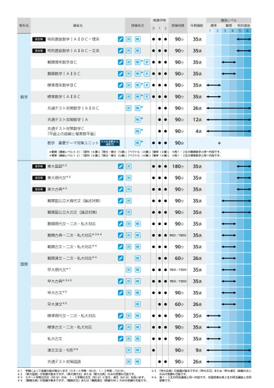 教科名講座名授業形式認定制特別選抜数学ⅠAⅡBC-理系認定制特別選抜数学ⅠAⅡBC-文系難関理系数学ⅢC難関数学ⅠAⅡBC標準理系数学ⅢC数学標準数学ⅠAⅡBC共通テスト対策数学ⅠAⅡBC共通テスト対策数学ⅠA共通テスト対策数学C「平面上の曲線と複素数平面」数学重要テーマ対策ユニット4つの分野から選択可★★★★★★★★開講学期ス12●●●●●●●●●●●●●●●●●●●●●●●●●●●授業時間年間講数標準難関1234特別選抜56講座レベル35講35講35講35講35講35講26講12講4講90分90分90分90分90分90分90分90分90分90分**難関(講座レベル3-4):「数列(6講)」「微分・積分(5講)」「ベクトル(4講)」「確率(4講)」※高1・2生の難関数学と同一内容です。*標準(講座レベル1-2):「数列(6講)」「微分・積分(6講)」「ベクトル(4講)」「確率(4講)」※高1・2生の標準数学と同一内容です。国語認定制東大国語※2認定制東大現代文※2認定制東大古典※2難関国公立大現代文(論述対策)難関国公立大古文(論述対策)難関現代文-二次・私大対応難関古典-二次・私大対応※3※4難関古文-二次・私大対応※4難関漢文-二次・私大対応※4早大現代文※1早大古典※3※5早大古文※5早大漢文※5標準現代文-二次・私大対応標準古文-二次・私大対応私大古文漢文文法・句形※6共通テスト対策国語●●●180分●●●●●●●●●●●●●●●90分90分90分90分90分●●●90分/150分●●●●●90分60分●●●90分/150分●●●90分/150分●●●●●●●●●●●●●●●●●90分60分90分90分90分90分90分35講35講35講35講35講35講35講35講26講35講35講35講26講35講35講35講9講26講※1学期によって授業分数が異なります(スタート学期:90分、1・2学期:150分)。※2「東大国語」の受講が基本ですが、「東大現代文」または「東大古典」のみの受講も可能です。※3スタート学期は古文(90分)のみ、1・2学期は古文(90分)に加え、漢文(60分)を扱います。※4「難関古典」の受講が基本ですが、「難関古文」または「難関漢文(映像のみ)」のみの受講も可能です。※5「早大古典」の受講が基本ですが、「早大古文」または「早大漢文(映像のみ)」※6高1・2生の同名講座と同一内容です。対面授業は高2生の同名講座と合同のみの受講も可能です。授業です。