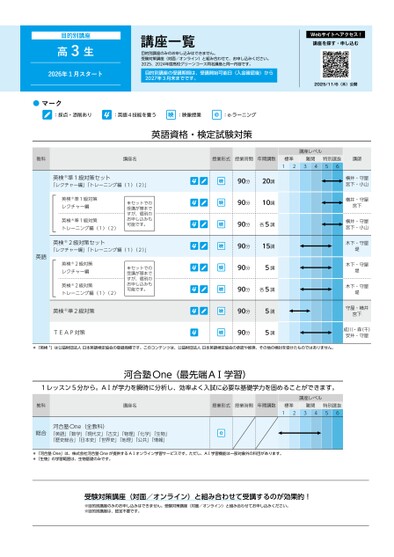 目的別講座高3生講座一覧目的別講座のみのお申し込みはできません。受験対策講座(対面/オンライン)と組み合わせて、お申し込みください。2025、2024年度高校グリーンコース同名講座と同一内容です。2026年1月スタート目的別講座の受講期間は、受講開始可能日(入金確認後)から2027年3月末までです。Webサイトへアクセス!講座を探す・申し込む2025/11/6(木)公開●マーク:採点・添削あり:英語4技能を養う:映像授業:e-ラーニング英語資格・検定試験対策教科講座名授業形式授業時間年間講数標準難関講座レベル英検®準1級対策セット「レクチャー編」「トレーニング編(1)(2)」英検®準1級対策レクチャー編英検®準1級対策トレーニング編(1)(2)※セットでの受講が基本ですが、個別のお申し込みも可能です。英検®2級対策セット「レクチャー編」「トレーニング編(1)(2)」英検®2級対策レクチャー編英検®2級対策トレーニング編(1)(2)※セットでの受講が基本ですが、個別のお申し込みも可能です。英語英検®準2級対策TEAP対策123490分20講90分10講90分各5講90分15講90分5講90分各5講90分90分5講5講特別選抜56講師横井・守屋宮下・小山横井・守屋宮下横井・守屋宮下・小山木下・守屋堤木下・守屋堤木下・守屋堤守屋・横井宮下成川・森(千)安井・守屋*「英検®」は公益財団法人日本英語検定協会の登録商標です。このコンテンツは、公益財団法人日本英語検定協会の承認や推奨、その他の検討を受けたものではありません。1レッスン5分から。AⅠが学力を瞬時に分析し、効率よく入試に必要な基礎学力を固めることができます。河合塾One(最先端AⅠ学習)教科総合講座名授業形式授業時間年間講数標準難関1234特別選抜56講座レベル河合塾One(全教科)「英語」「数学」「現代文」「古文」「物理」「化学」「生物」「歴史総合」「日本史」「世界史」「地理」「公共」「情報」*「河合塾One」は、株式会社河合塾Oneが提供するAⅠオンライン学習サービスです。ただし、AⅠ学習機能は一部対象外の科目があります。*「生物」の学習範囲は、生物基礎のみです。受験対策講座(対面/オンライン)と組み合わせて受講するのが効果的!※目的別講座のみのお申し込みはできません。受験対策講座(対面/オンライン)と組み合わせてお申し込みください。※目的別講座は、認定不要です。