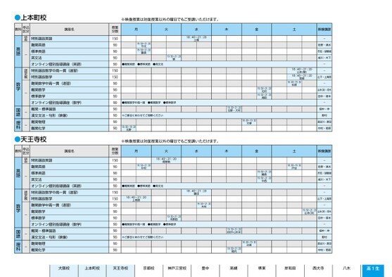 大阪校上本町校天王寺校京都校神戸三宮校豊中高槻堺東岸和田西大寺八木高1生教科申込区分講座名上本町●上本町校1ページ●2026年度/51/近畿/上本町/高1生/パターン6617/2026_51_5_513_31_20250816192104.csv●2026/51/近畿/天王寺/高1生/パターン6617/2026_51_5_515_校了時削除1ペー※映像授業は対面授業以外の曜日でもご受講いただけます。月火水木金土19:50〜21:2019:50〜21:20千代藤森18:40〜21:20土橋19:50〜21:20慎●難関英語●標準英語●英文法●難関数学中高一貫●難関数学●標準数学※ご都合にあわせてご視聴ください18:00〜19:30北野19:50〜21:20北野・大村18:00〜19:30大學19:50〜21:2019:50〜21:20北村湘田18:40〜21:20山本(敏)18:40〜21:20宮崎18:00〜19:30杉原※映像授業は対面授業以外の曜日でもご受講いただけます。月火水木金土19:50〜21:2019:50〜21:20藤森中新18:40〜21:20胡摩﨑19:50〜21:20中村●難関英語●標準英語●英文法18:40〜21:20上高原18:40〜21:20藤田19:50〜21:20木村●難関数学中高一貫●難関数学●標準数学19:50〜21:20河原田※ご都合にあわせてご視聴ください19:50〜21:20佐佐木・山本佐木・山本)18:00〜19:30辻居19:50〜21:20岡内18:00〜19:30戸谷19:50〜21:20山本(洋)映像講師-佐野・清水市位・胡摩﨑成川・木下--山下・上高原-山本(洋)・府木田中・塚本-畑中・仲野村長谷川・原田中村・若原映像講師-佐野・清水市位・胡摩﨑成川・木下--山下・上高原-山本(洋)・府木田中・塚本-畑中・仲野村長谷川・原田中村・若原授業分数150909090901501509090909090909090授業分数150909090901501509090909090909090特別選抜英語難関英語標準英語英文法オンライン個別指導講座(英語)特別選抜数学中高一貫(速習)特別選抜数学難関数学中高一貫(速習)難関数学標準数学オンライン個別指導講座(数学)難関・標準国語漢文文法・句形(映像)難関物理難関化学認定制-認定制---英語数学国語理科天王寺●天王寺校特別選抜英語難関英語標準英語英文法オンライン個別指導講座(英語)特別選抜数学中高一貫(速習)特別選抜数学難関数学中高一貫(速習)難関数学標準数学オンライン個別指導講座(数学)難関・標準国語漢文文法・句形(映像)難関物理難関化学認定制-認定制---英語数学国語理科教科申込区分講座名