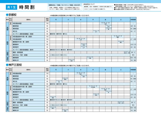 時間割授業形式は、「対面」「オンライン」「映像」があります。「対面」:授業曜日・時間帯は、以下の時間割をご確認ください。「オンライン(個別)」「映像」:ご都合にあわせてご受講ください。*申込区分について認定制「認定(受講資格)」の取得が必要な講座です。ーどなたでも受講できる講座です。●受験対策講座(映像)のみのお申し込みはできません。受験対策講座(対面/オンライン)と組み合わせて、お申し込みください。●同一名称の講座は設置校舎・曜日・時間帯・授業形式が異なっても同一内容です。●担当講師は変更になる場合があります。あらかじめご了承ください。高1生京都●京都校教科申込区分講座名※映像授業は対面授業以外の曜日でもご受講いただけます。月火水木金土18:40〜21:20土橋19:50〜21:20白井19:50〜21:20巽16:50〜19:30藤野18:00〜19:30瀬古19:50〜21:20野口(た)・伊賀●難関英語●標準英語●英文法19:50〜21:20木下18:40〜21:20上村19:50〜21:2019:50〜21:20河村山下●難関数学中高一貫●難関数学●標準数学※ご都合にあわせてご視聴ください19:50〜21:20大野18:00〜19:30大學※映像授業は対面授業以外の曜日でもご受講いただけます。月火水木金土18:40〜21:20清水19:50〜21:20西内18:00〜19:30島田19:50〜21:20慎●難関英語●標準英語●英文法18:00〜19:30湘田●難関数学中高一貫●難関数学●標準数学18:40〜21:20山本(敏)19:50〜21:20松井18:40〜21:20権田19:50〜21:20岸18:00〜19:30中田・大村※ご都合にあわせてご視聴ください18:00〜19:30野村18:00〜19:30宮路映像講師-佐野・清水市位・胡摩﨑成川・木下--山下・上高原-山本(洋)・府木田中・塚本-畑中・仲野村長谷川・原田中村・若原映像講師-佐野・清水市位・胡摩﨑成川・木下--山下・上高原-山本(洋)・府木田中・塚本-畑中・仲野村長谷川・原田中村・若原授業分数150909090901501509090909090909090授業分数150909090901501509090909090909090特別選抜英語難関英語標準英語英文法オンライン個別指導講座(英語)特別選抜数学中高一貫(速習)特別選抜数学難関数学中高一貫(速習)難関数学標準数学オンライン個別指導講座(数学)難関・標準国語漢文文法・句形(映像)難関物理難関化学認定制-認定制---英語数学国語理科特別選抜英語難関英語標準英語英文法オンライン個別指導講座(英語)特別選抜数学中高一貫(速習)特別選抜数学難関数学中高一貫(速習)難関数学標準数学オンライン個別指導講座(数学)難関・標準国語漢文文法・句形(映像)難関物理難関化学認定制-認定制---英語数学国語理科教科申込区分講座名神戸三宮●神戸三宮校1ページ●2026年度/51/近畿/京都/高1生/パターン6617/2026_51_5_531_31_20250816192104.csv●2026年度/1/近畿/神戸三宮/高1生/パターン6617/202校了時削除1ペジ