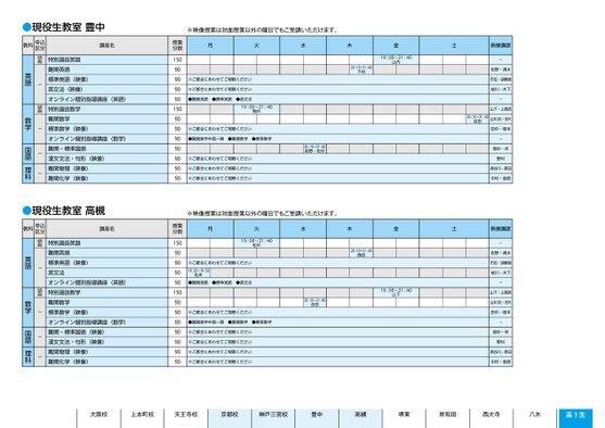 大阪校上本町校天王寺校京都校神戸三宮校豊中高槻堺東岸和田西大寺八木高1生※映像授業は対面授業以外の曜日でもご受講いただけます。月火水木金土19:00〜21:40山内20:10〜21:40下村※ご都合にあわせてご視聴ください※ご都合にあわせてご視聴ください●難関英語●標準英語●英文法19:00〜21:40駒井※ご都合にあわせてご視聴ください●難関数学中高一貫●難関数学●標準数学※ご都合にあわせてご視聴ください※ご都合にあわせてご視聴ください※ご都合にあわせてご視聴ください20:10〜21:40前野・松村※映像授業は対面授業以外の曜日でもご受講いただけます。月火水木金土20:10〜21:40西田20:10〜21:40吉田19:00〜21:40山下19:00〜21:40松井※ご都合にあわせてご視聴ください18:20〜19:50松本●難関英語●標準英語●英文法※ご都合にあわせてご視聴ください●難関数学中高一貫●難関数学●標準数学※ご都合にあわせてご視聴ください※ご都合にあわせてご視聴ください※ご都合にあわせてご視聴ください※ご都合にあわせてご視聴ください授業分数1509090909015090909090909090授業分数150909090901509090909090909020:10〜21:40吉田映像講師-佐野・清水市位・胡摩﨑成川・木下-山下・上高原山本(洋)・府木田中・塚本-畑中・仲野村長谷川・原田中村・若原映像講師-佐野・清水市位・胡摩﨑成川・木下-山下・上高原山本(洋)・府木田中・塚本-畑中・仲野村長谷川・原田中村・若原特別選抜英語難関英語標準英語(映像)英文法(映像)オンライン個別指導講座(英語)特別選抜数学難関数学標準数学(映像)オンライン個別指導講座(数学)難関・標準国語漢文文法・句形(映像)難関物理(映像)難関化学(映像)認定制-認定制---英語数学国語理科豊中●現役生教室豊中教科申込区分講座名特別選抜英語難関英語標準英語(映像)英文法オンライン個別指導講座(英語)特別選抜数学難関数学標準数学(映像)オンライン個別指導講座(数学)難関・標準国語(映像)漢文文法・句形(映像)難関物理(映像)難関化学(映像)認定制-認定制---英語数学国語理科高槻教室●現役生教室高槻教科申込区分講座名26_51_5_514_31_20250816194758.csvページ校了時削除226年/51/近畿/豊中/高1生/パターン6617/2026_51_5_563_31_20250816192104.csv202年度/51/近/高教室/高1生/パターン6617/2026_51_5_540校了時削除1ページ