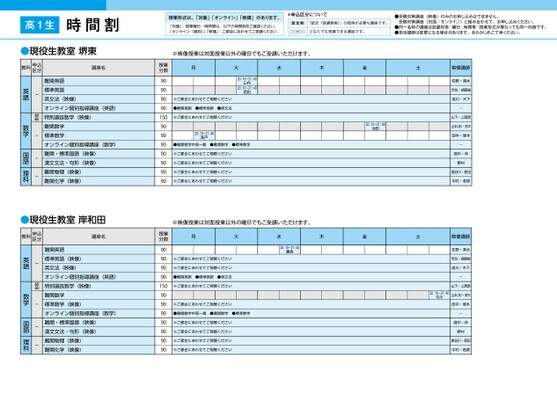 高1生時間割授業形式は、「対面」「オンライン」「映像」があります。「対面」:授業曜日・時間帯は、以下の時間割をご確認ください。「オンライン(個別)」「映像」:ご都合にあわせてご受講ください。*申込区分について認定制「認定(受講資格)」の取得が必要な講座です。ーどなたでも受講できる講座です。●受験対策講座(映像)のみのお申し込みはできません。受験対策講座(対面/オンライン)と組み合わせて、お申し込みください。●同一名称の講座は設置校舎・曜日・時間帯・授業形式が異なっても同一内容です。●担当講師は変更になる場合があります。あらかじめご了承ください。※映像授業は対面授業以外の曜日でもご受講いただけます。月火水木金土20:10〜21:4020:10〜21:40山内西田※ご都合にあわせてご視聴ください●難関英語●標準英語●英文法授業分数90909090150※ご都合にあわせてご視聴ください90909090909090授業分数9090909020:10〜21:40髙戸●難関数学中高一貫●難関数学●標準数学20:10〜21:40池田※ご都合にあわせてご視聴ください※ご都合にあわせてご視聴ください※ご都合にあわせてご視聴ください※ご都合にあわせてご視聴ください※映像授業は対面授業以外の曜日でもご受講いただけます。月火※ご都合にあわせてご視聴ください※ご都合にあわせてご視聴ください●難関英語●標準英語●英文法木金土水20:10〜21:40藤森150※ご都合にあわせてご視聴ください90909090909090※ご都合にあわせてご視聴ください●難関数学中高一貫●難関数学●標準数学※ご都合にあわせてご視聴ください※ご都合にあわせてご視聴ください※ご都合にあわせてご視聴ください※ご都合にあわせてご視聴ください映像講師佐野・清水市位・胡摩﨑成川・木下-山下・上高原山本(洋)・府木田中・塚本-畑中・仲野村長谷川・原田中村・若原師講像映佐野・清水市位・胡摩﨑成川・木下-山下・上高原山本(洋)・府木田中・塚本-畑中・仲野村長谷川・原田中村・若原20:10〜21:40中川講座名難関英語標準英語英文法(映像)オンライン個別指導講座(英語)特別選抜数学(映像)難関数学標準数学オンライン個別指導講座(数学)難関・標準国語(映像)漢文文法・句形(映像)難関物理(映像)難関化学(映像)教科申込区分-認定制---英語数学国語理科講座名難関英語標準英語(映像)英文法(映像)オンライン個別指導講座(英語)特別選抜数学(映像)難関数学標準数学(映像)オンライン個別指導講座(数学)難関・標準国語(映像)漢文文法・句形(映像)難関物理(映像)難関化学(映像)教科申込区分-認定制---英語数学国語理科岸和田●現役生教室岸和田堺東●現役生教室堺東1ページ●2026年度/51/近畿/堺東/高1生/パターン6617/2026_51_5_533_31_20250816192104.csv2026年/51/近/岸田/高1生/パターン6617/2026_51校了時削除1ページ