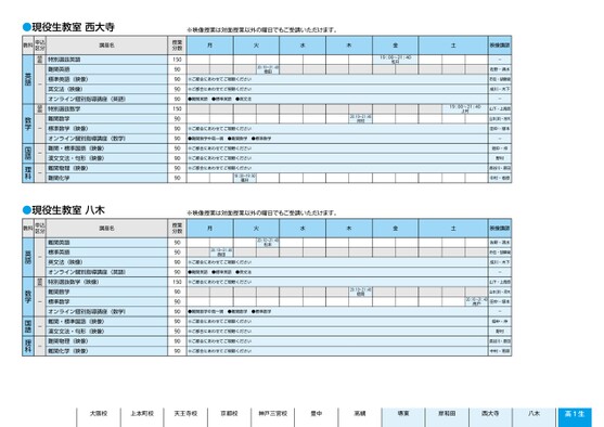 大阪校上本町校天王寺校京都校神戸三宮校豊中高槻堺東岸和田西大寺八木高1生※映像授業は対面授業以外の曜日でもご受講いただけます。月火水木金土19:00〜21:40松井20:10〜21:40河村19:00〜21:40上村20:10〜21:40増田※ご都合にあわせてご視聴ください※ご都合にあわせてご視聴ください●難関英語●標準英語●英文法※ご都合にあわせてご視聴ください●難関数学中高一貫●難関数学●標準数学※ご都合にあわせてご視聴ください※ご都合にあわせてご視聴ください※ご都合にあわせてご視聴ください18:20〜19:50福井※映像授業は対面授業以外の曜日でもご受講いただけます。水木金土火20:10〜21:40松本月20:10〜21:40西田※ご都合にあわせてご視聴ください●難関英語●標準英語●英文法授業分数1509090909015090909090909090授業分数90909090150※ご都合にあわせてご視聴ください90909090909090●難関数学中高一貫●難関数学●標準数学※ご都合にあわせてご視聴ください※ご都合にあわせてご視聴ください※ご都合にあわせてご視聴ください※ご都合にあわせてご視聴ください20:10〜21:40信岡20:10〜21:40髙戸映像講師-佐野・清水市位・胡摩﨑成川・木下-山下・上高原山本(洋)・府木田中・塚本-畑中・仲野村長谷川・原田中村・若原映像講師佐野・清水市位・胡摩﨑成川・木下-山下・上高原山本(洋)・府木田中・塚本-畑中・仲野村長谷川・原田中村・若原特別選抜英語難関英語標準英語(映像)英文法(映像)オンライン個別指導講座(英語)特別選抜数学難関数学標準数学(映像)オンライン個別指導講座(数学)難関・標準国語(映像)漢文文法・句形(映像)難関物理(映像)難関化学認定制-認定制---英語数学国語理科西大寺●現役生教室西大寺教科申込区分講座名講座名難関英語標準英語英文法(映像)オンライン個別指導講座(英語)特別選抜数学(映像)難関数学標準数学オンライン個別指導講座(数学)難関・標準国語(映像)漢文文法・句形(映像)難関物理(映像)難関化学(映像)教科申込区分-認定制---英語数学国語理科八木●現役生教室八木51_5_564_31_20250816192104.csv1ページ校了時削除●2026年度/51/近畿/西大寺/高1生/パターン6617/2026_51_5_535_31_20250816192104.csv●6年度/5近畿八木高1生/パターン6617/2026_51_5_538_31_校了時削除1ージ
