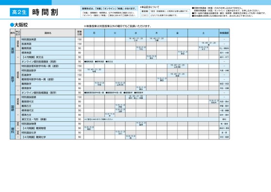 時間割授業形式は、「対面」「オンライン」「映像」があります。「対面」:授業曜日・時間帯は、以下の時間割をご確認ください。「オンライン(個別)」「映像」:ご都合にあわせてご受講ください。*申込区分について認定制「認定(受講資格)」の取得が必要な講座です。ーどなたでも受講できる講座です。●受験対策講座(映像)のみのお申し込みはできません。受験対策講座(対面/オンライン)と組み合わせて、お申し込みください。●同一名称の講座は設置校舎・曜日・時間帯・授業形式が異なっても同一内容です。●担当講師は変更になる場合があります。あらかじめご了承ください。※映像授業は対面授業以外の曜日でもご受講いただけます。月火水木金土映像講師18:40〜21:20江本18:40〜21:20刀19:50〜21:20千代18:00〜19:30清水19:50〜21:20藤田19:50〜21:20原田18:40〜21:20山本(敏)18:40〜21:20西浦●難関英語●標準英語●英文法18:40〜21:20寺尾19:50〜21:20中田19:50〜21:20山本(洋)●難関理系数学中高一貫●難関数学中高一貫●難関数学19:50〜21:20瀬古●標準数学18:20〜21:00畑中・阪上・幸重18:00〜19:30仲※ご都合にあわせてご視聴ください18:00〜19:30植田19:50〜21:2019:50〜21:20伊賀北野19:50〜21:20瀧澤19:50〜21:20古川18:00〜19:30西18:40〜21:20慎18:00〜19:30木下19:50〜21:20佐佐木--村上・髙橋(保)成川・大島成川・木下--大庭・水嶋--依田・合田河合・吉嗣--光田・清水伊藤・菅井一路・斎藤田中・酒井野村乾・窪田長谷川・原田金・原中村・若原授業分数1501509090909015015015090909090150909090909090909090講座名特別選抜英語医進英語難関英語標準英語【4月開講】英文法オンライン個別指導講座(英語)特別選抜理系数学中高一貫(速習)特別選抜数学医進数学難関理系数学中高一貫(速習)難関数学標準数学オンライン個別指導講座(数学)特別選抜国語難関現代文難関古文標準現代文標準古文漢文文法・句形(映像)特別選抜物理【4月開講】難関物理特別選抜化学【4月開講】難関化学認定制-認定制-認定制-認定制-認定制-英語数学国語理科高2生大阪●大阪校教科申込区分1ページ●2026年度/51/近畿/大阪/高2生/パターン6617/2026_51_5_511_32_20250816192119.csv校了時削除