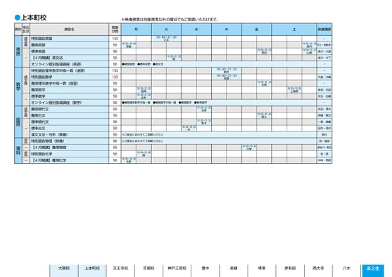 大阪校上本町校天王寺校京都校神戸三宮校豊中高槻堺東岸和田西大寺八木高2生※映像授業は対面授業以外の曜日でもご受講いただけます。月火水木金土18:00〜19:30津留18:40〜21:20江本19:50〜21:20慎●難関英語●標準英語●英文法19:50〜21:2019:50〜21:20信岡北村●難関理系数学中高一貫●難関数学中高一貫●難関数学●標準数学19:50〜21:20北野19:50〜21:20青木18:00〜19:30仲※ご都合にあわせてご視聴ください※ご都合にあわせてご視聴ください19:50〜21:20西18:00〜19:30北野18:40〜21:2018:40〜21:20駒井宮崎19:50〜21:2019:50〜21:20西内山崎18:00〜19:30上高原19:50〜21:20高田19:50〜21:20杉原19:50〜21:20阪上18:00〜19:30大學映像講師-村上・髙橋(保)成川・大島成川・木下--大庭・水嶋-依田・合田河合・吉嗣-光田・清水伊藤・菅井一路・斎藤田中・酒井野村乾・窪田長谷川・原田金・原中村・若原授業分数1509090909015015090909090909090909090909090特別選抜英語難関英語標準英語【4月開講】英文法オンライン個別指導講座(英語)特別選抜理系数学中高一貫(速習)特別選抜数学難関理系数学中高一貫(速習)難関数学標準数学オンライン個別指導講座(数学)難関現代文難関古文標準現代文標準古文漢文文法・句形(映像)特別選抜物理(映像)【4月開講】難関物理特別選抜化学【4月開講】難関化学認定制-認定制-認定制-認定制-認定制-英語数学国語理科上本町●上本町校教科申込区分講座名1ページ●2026年度/51/近畿/上本町/高2生/パターン6617/2026_51_5_513_32_20250816192119.csv校了時削除