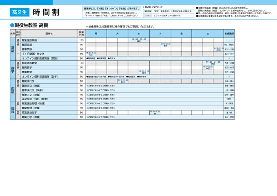 授業形式は、「対面」「オンライン」「映像」があります。「対面」:授業曜日・時間帯は、以下の時間割をご確認ください。「オンライン(個別)」「映像」:ご都合にあわせてご受講ください。*申込区分について認定制「認定(受講資格)」の取得が必要な講座です。ーどなたでも受講できる講座です。●受験対策講座(映像)のみのお申し込みはできません。受験対策講座(対面/オンライン)と組み合わせて、お申し込みください。●同一名称の講座は設置校舎・曜日・時間帯・授業形式が異なっても同一内容です。●担当講師は変更になる場合があります。あらかじめご了承ください。※映像授業は対面授業以外の曜日でもご受講いただけます。月火水木金土19:00〜21:40横井20:10〜21:40堂前20:10〜21:40西田18:20〜19:50松本●難関英語●標準英語●英文法19:00〜21:40駒井18:20〜19:50中田●難関理系数学中高一貫●難関数学中高一貫●難関数学20:10〜21:40奥村20:10〜21:40関口●標準数学※ご都合にあわせてご視聴ください※ご都合にあわせてご視聴ください※ご都合にあわせてご視聴ください※ご都合にあわせてご視聴ください※ご都合にあわせてご視聴ください※ご都合にあわせてご視聴ください※ご都合にあわせてご視聴ください18:20〜19:50西映像講師-村上・髙橋(保)成川・大島成川・木下-大庭・水嶋依田・合田河合・吉嗣-光田・清水伊藤・菅井一路・斎藤田中・酒井野村乾・窪田長谷川・原田金・原中村・若原授業分数15090909090150909090909090909090909090特別選抜英語難関英語標準英語【4月開講】英文法オンライン個別指導講座(英語)特別選抜数学難関数学標準数学オンライン個別指導講座(数学)難関現代文難関古文(映像)標準現代文(映像)標準古文(映像)漢文文法・句形(映像)特別選抜物理(映像)難関物理(映像)特別選抜化学難関化学(映像)認定制-認定制-認定制-認定制-認定制-英語数学国語理科教科申込区分講座名高2生時間割高槻教室●現役生教室高槻1ページ●2026年度/51/近畿/高槻教室/高2生/パターン6617/2026_51_5_540_32_20250816192119.csv校了時削除