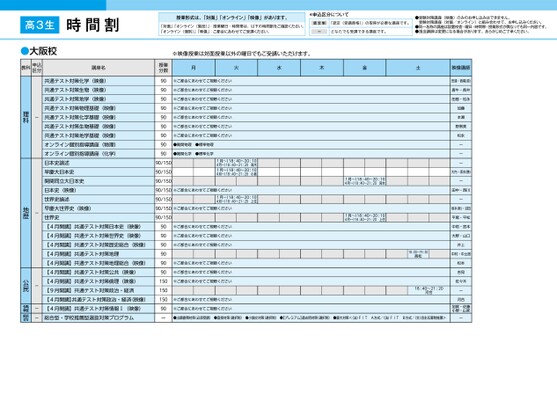 映像講師安達・西尾(源)唐牛・長井田島・松永加藤本瀬野黒美松永ーーー大内・坂本(勝)ー田中・西川ー坂本(新)・沼田平尾・平松中垣・宮本大野・山口井上中村・中土居松本吉見佐々木ー河合加賀・佐藤小野・山家1月〜)18:40〜20:104月〜)18:40〜21:20宮本1月〜)18:40〜20:104月〜)18:40〜21:20上住18:00〜19:30高松18:40〜21:20河合●出願書類対策(必須受講)●面接対策(選択制)●小論文対策(選択制)●【プレミアム】過去問対策(選択制)●慶大対策<(法)FITA方式/(法)FITB方式/(文)自主応募制推薦>ー時間割授業形式は、「対面」「オンライン」「映像」があります。「対面」「オンライン(集団)」:授業曜日・時間帯は、以下の時間割をご確認ください。「オンライン(個別)」「映像」:ご都合にあわせてご受講ください。*申込区分について認定制「認定(受講資格)」の取得が必要な講座です。ーどなたでも受講できる講座です。●受験対策講座(映像)のみのお申し込みはできません。受験対策講座(対面/オンライン)と組み合わせて、お申し込みください。●同一名称の講座は設置校舎・曜日・時間帯・授業形式が異なっても同一内容です。●担当講師は変更になる場合があります。あらかじめご了承ください。※映像授業は対面授業以外の曜日でもご受講いただけます。月火水木金土※ご都合にあわせてご視聴ください※ご都合にあわせてご視聴ください※ご都合にあわせてご視聴ください※ご都合にあわせてご視聴ください※ご都合にあわせてご視聴ください※ご都合にあわせてご視聴ください※ご都合にあわせてご視聴ください●難関物理●標準物理●難関化学●標準化学1月〜)18:40〜20:104月〜)18:40〜21:20高木1月〜)18:40〜20:104月〜)18:40〜21:20小倉90/150※ご都合にあわせてご視聴ください90/1501月〜)18:40〜20:10上住4月〜)18:40〜21:2090/150※ご都合にあわせてご視聴ください※ご都合にあわせてご視聴ください※ご都合にあわせてご視聴ください※ご都合にあわせてご視聴ください※ご都合にあわせてご視聴ください※ご都合にあわせてご視聴ください※ご都合にあわせてご視聴ください※ご都合にあわせてご視聴ください※ご都合にあわせてご視聴ください授業分数90909090909090909090/15090/15090/15090/15090909090909015015015090ー講座名共通テスト対策化学(映像)共通テスト対策生物(映像)共通テスト対策地学(映像)共通テスト対策物理基礎(映像)共通テスト対策化学基礎(映像)共通テスト対策生物基礎(映像)共通テスト対策地学基礎(映像)オンライン個別指導講座(物理)オンライン個別指導講座(化学)日本史論述早慶大日本史関関同立大日本史日本史(映像)世界史論述早慶大世界史(映像)世界史【4月開講】共通テスト対策日本史(映像)【4月開講】共通テスト対策世界史(映像)【4月開講】共通テスト対策歴史総合(映像)【4月開講】共通テスト対策地理【4月開講】共通テスト対策地理総合(映像)【4月開講】共通テスト対策公共(映像)【4月開講】共通テスト対策倫理(映像)【9月開講】共通テスト対策政治・経済【4月開講】共通テスト対策政治・経済(映像)【4月開講】共通テスト対策情報Ⅰ(映像)総合型・学校推薦型選抜対策プログラム-理科-地歴---公民情報総合高3生大阪●大阪校教科申込区分5ページ●2026年度/51/近畿/大阪/高3・卒生/パターン6617/2026_51_5_511_11_20250817173134.csv校了時削除