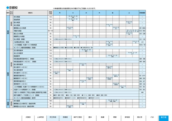 大阪校上本町校天王寺校京都校神戸三宮校豊中高槻堺東岸和田西大寺八木高3生※映像授業は対面授業以外の曜日でもご受講いただけます。月火水木金土映像講師18:00〜19:30片山1月〜)18:40〜20:104月〜)18:40〜21:20白井18:00〜19:30巽ーーーー佐野・胡摩﨑柴田(卓)・髙橋(慶)安井・近藤ー吉川・大島19:50〜21:20谷小林柴田(祐)・守屋18:00〜19:30谷19:50〜21:20谷18:00〜19:30巽18:00〜19:30白井18:40〜21:20瀬古18:40〜21:20山下18:00〜19:30瀬戸山18:00〜19:30河原田19:50〜21:20瀬戸山19:50〜21:20河原田16:00〜17:30瀬古ーーーー樋原・須藤秦野・堀尾ーーーー依田・山本(洋)樋原・宮田高梨・波平秦野・永島森本・清水森本・清水湘田ーーーーー※ご都合にあわせてご視聴ください※ご都合にあわせてご視聴ください●数列(難関/標準)●微分・積分(難関/標準)●ベクトル(難関/標準)●確率(難関/標準)●難関理系数学ⅢC●難関数学ⅠAⅡBC●標準理系数学ⅢC●標準数学ⅠAⅡBC18:00〜19:30中崎18:00〜19:30塚野18:00〜21:20中崎・伊賀18:40〜21:2018:40〜21:20佐野横井18:00〜19:30木下※ご都合にあわせてご視聴ください19:50〜21:20谷●難関国公立大英語●国公立大英語●私大英語●入試頻出英文法・語法18:40〜21:20藤野※ご都合にあわせてご視聴ください※ご都合にあわせてご視聴ください18:00〜19:30瀬古18:00〜19:30瀬古18:00〜19:30河村19:50〜21:20宮崎18:00〜19:30山下授業分数15015090909090/15090909090909015015015015090909090909090909090909090901809090京大英語医進英語阪大英語神大英語難関国公立大英語早慶大英語国公立大英語関関同立大英語私大英語(映像)入試頻出英文法・語法【4月開講】共通テスト対策英語オンライン個別指導講座(英語)京大理系数学京大文系数学医進数学特別選抜理系数学ⅢC(映像)特別選抜数学ⅠAⅡBC(映像)阪大理系数学阪大数学ⅠAⅡBC神大理系数学神大数学ⅠAⅡBC難関理系数学ⅢC難関数学ⅠAⅡBC標準理系数学ⅢC標準数学ⅠAⅡBC【4月開講】共通テスト対策数学ⅠAⅡBC共通テスト対策数学ⅠA(映像)共通テスト対策数学C「平面上の曲線と複素数平面」映像)数学重要テーマ対策ユニット(映像)オンライン個別指導講座(数学)京大国語難関国公立大現代文(論述対策)難関国公立大古文(論述対策)認定制-認定制-英語数学認定制国語京都●京都校教科申込区分講座名1ページ●2026年度/51/近畿/京都/高3・卒生/パターン6617/2026_51_5_531_11_20250817173134.csv2校了時削除