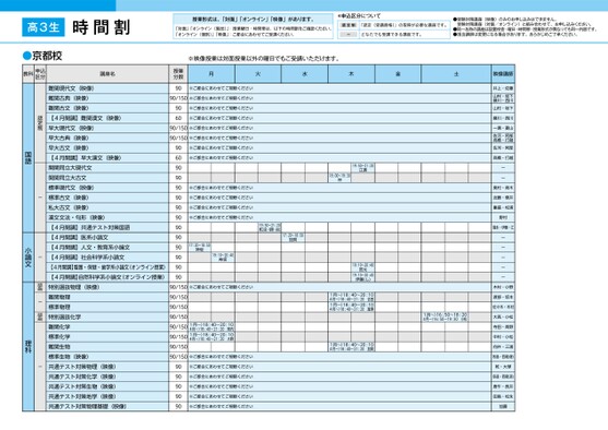 時間割授業形式は、「対面」「オンライン」「映像」があります。「対面」「オンライン(集団)」:授業曜日・時間帯は、以下の時間割をご確認ください。「オンライン(個別)」「映像」:ご都合にあわせてご受講ください。*申込区分について認定制「認定(受講資格)」の取得が必要な講座です。ーどなたでも受講できる講座です。●受験対策講座(映像)のみのお申し込みはできません。受験対策講座(対面/オンライン)と組み合わせて、お申し込みください。●同一名称の講座は設置校舎・曜日・時間帯・授業形式が異なっても同一内容です。●担当講師は変更になる場合があります。あらかじめご了承ください。高3生京都●京都校教科申込区分3ページ●2026年度/51/近畿/京都/高3・卒生/パターン6617/2026_51_5_531_11_20250817173134.csv校了時削除※映像授業は対面授業以外の曜日でもご受講いただけます。月火水木金土※ご都合にあわせてご視聴ください授業分数9090/150※ご都合にあわせてご視聴ください9060※ご都合にあわせてご視聴ください※ご都合にあわせてご視聴ください90/150※ご都合にあわせてご視聴ください90/150※ご都合にあわせてご視聴ください※ご都合にあわせてご視聴ください※ご都合にあわせてご視聴ください※ご都合にあわせてご視聴ください※ご都合にあわせてご視聴ください※ご都合にあわせてご視聴ください※ご都合にあわせてご視聴ください17:20〜18:50神坂19:10〜20:40神坂906090909090909090909090909090/150※ご都合にあわせてご視聴ください90/15090/15090/15090/15090/15090/1501月〜)18:40〜20:104月〜)18:40〜21:20岡内1月〜)18:40〜20:104月〜)18:40〜21:20大野90/150※ご都合にあわせてご視聴ください9090909090※ご都合にあわせてご視聴ください※ご都合にあわせてご視聴ください※ご都合にあわせてご視聴ください※ご都合にあわせてご視聴ください※ご都合にあわせてご視聴ください19:50〜21:20江濵18:00〜19:30仲19:50〜21:20野口(良)・塚野・永松17:20〜18:50加賀19:10〜20:40宮元19:10〜20:40伊藤(し)1月〜)18:40〜20:104月〜)18:40〜21:20吉田1月〜)18:40〜20:104月〜)18:40〜21:20瀧澤1月〜)18:40〜20:104月〜)18:40〜21:20加賀1月〜)16:50〜18:204月〜)16:50〜19:30小松映像講師井上・佐藤山村・坂下藤川・西川山村・坂下藤川・西川一瀬・菱山佐河・阿部髙橋・打越佐河・阿部髙橋・打越ーー奥村・青木近藤・菅井重盛・松浦野村福永・伊藤・江ーーーーー木村・小野渡部・坂本佐々木・木村大髙・小松寺田・青野中村・小松向井・三浦牧島・西尾(健)乾・大學安達・西尾(源)唐牛・長井田島・松永加藤講座名難関現代文(映像)難関古典(映像)難関古文(映像)【4月開講】難関漢文(映像)早大現代文(映像)早大古典(映像)早大古文(映像)【4月開講】早大漢文(映像)関関同立大現代文関関同立大古文標準現代文(映像)標準古文(映像)私大古文(映像)漢文文法・句形(映像)【4月開講】共通テスト対策国語【4月開講】医系小論文【4月開講】人文・教育系小論文【4月開講】社会科学系小論文【4月開講】看護・保健・歯学系小論文(オンライン授業)【4月開講】自然科学系小論文(オンライン授業)特別選抜物理(映像)難関物理標準物理特別選抜化学難関化学標準化学難関生物標準生物(映像)共通テスト対策物理(映像)共通テスト対策化学(映像)共通テスト対策生物(映像)共通テスト対策地学(映像)共通テスト対策物理基礎(映像)認定制--認定制-認定制-国語小論文理科