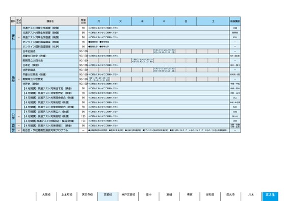大阪校上本町校天王寺校京都校神戸三宮校豊中高槻堺東岸和田西大寺八木高3生月火水木金土映像講師1月〜)18:40〜20:104月〜)18:40〜21:20高木1月〜)18:40〜20:104月〜)18:40〜21:20小倉1月〜)18:40〜20:104月〜)18:40〜21:20上住本瀬野黒美松永ーーー大内・坂本(勝)ー田中・西川ー坂本(新)・沼田ー平尾・平松中垣・宮本大野・山口井上中村・中土居松本吉見佐々木河合加賀・佐藤小野・山家●出願書類対策(必須受講)●面接対策(選択制)●小論文対策(選択制)●【プレミアム】過去問対策(選択制)●慶大対策<(法)FITA方式/(法)FITB方式/(文)自主応募制推薦>ー※ご都合にあわせてご視聴ください※ご都合にあわせてご視聴ください※ご都合にあわせてご視聴ください●難関物理●標準物理●難関化学●標準化学90/150※ご都合にあわせてご視聴ください90/15090/150※ご都合にあわせてご視聴ください90/15090/150※ご都合にあわせてご視聴ください90/1501月〜)18:40〜20:104月〜)18:40〜21:20前田90/150※ご都合にあわせてご視聴ください※ご都合にあわせてご視聴ください※ご都合にあわせてご視聴ください※ご都合にあわせてご視聴ください※ご都合にあわせてご視聴ください※ご都合にあわせてご視聴ください※ご都合にあわせてご視聴ください※ご都合にあわせてご視聴ください※ご都合にあわせてご視聴ください※ご都合にあわせてご視聴ください90909090909015015090ー授業分数909090909090/150共通テスト対策化学基礎(映像)共通テスト対策生物基礎(映像)共通テスト対策地学基礎(映像)オンライン個別指導講座(物理)オンライン個別指導講座(化学)日本史論述早慶大日本史(映像)関関同立大日本史日本史(映像)世界史論述早慶大世界史(映像)関関同立大世界史世界史(映像)【4月開講】共通テスト対策日本史(映像)【4月開講】共通テスト対策世界史(映像)【4月開講】共通テスト対策歴史総合(映像)【4月開講】共通テスト対策地理(映像)【4月開講】共通テスト対策地理総合(映像)【4月開講】共通テスト対策公共(映像)【4月開講】共通テスト対策倫理(映像)【4月開講】共通テスト対策政治・経済(映像)【4月開講】共通テスト対策情報Ⅰ(映像)総合型・学校推薦型選抜対策プログラム-理科-地歴---公民情報総合京都教科申込区分講座名5ページ●2026年度/51/近畿/京都/高3・卒生/パターン6617/2026_51_5_531_11_20250817173134.csv2校了時削除