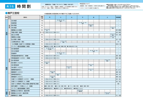 授業形式は、「対面」「オンライン」「映像」があります。「対面」「オンライン(集団)」:授業曜日・時間帯は、以下の時間割をご確認ください。「オンライン(個別)」「映像」:ご都合にあわせてご受講ください。*申込区分について認定制「認定(受講資格)」の取得が必要な講座です。ーどなたでも受講できる講座です。●受験対策講座(映像)のみのお申し込みはできません。受験対策講座(対面/オンライン)と組み合わせて、お申し込みください。●同一名称の講座は設置校舎・曜日・時間帯・授業形式が異なっても同一内容です。●担当講師は変更になる場合があります。あらかじめご了承ください。※映像授業は対面授業以外の曜日でもご受講いただけます。月火水木金土映像講師18:40〜21:20堂前18:40〜21:20佐野18:00〜19:30西内19:50〜21:20国松18:00〜19:30慎19:50〜21:2019:50〜21:20清水久末90/150※ご都合にあわせてご視聴ください9090909090901501501501509090909090909090909090909090909090※ご都合にあわせてご視聴ください※ご都合にあわせてご視聴ください19:50〜21:20島田●難関国公立大英語18:40〜21:20山本(敏)●国公立大英語●私大英語●入試頻出英文法・語法18:40〜21:20池田※ご都合にあわせてご視聴ください※ご都合にあわせてご視聴ください18:00〜19:30涌谷19:50〜21:20涌谷19:50〜21:20湘田18:00〜19:30湘田※ご都合にあわせてご視聴ください※ご都合にあわせてご視聴ください※ご都合にあわせてご視聴ください18:00〜19:30岸18:40〜21:20寺尾18:00〜19:30木村18:00〜19:30岸●数列(難関/標準)●微分・積分(難関/標準)●ベクトル(難関/標準)●確率(難関/標準)●難関理系数学ⅢC●難関数学ⅠAⅡBC●標準理系数学ⅢC●標準数学ⅠAⅡBC18:00〜19:30一番合戦※ご都合にあわせてご視聴ください18:00〜19:30藤田18:00〜19:30山本(ま)山本ーーーー佐野・胡摩﨑柴田(卓)・髙橋(慶)安井・近藤ー吉川・大島小林柴田(祐)・守屋ーーーー樋原・須藤秦野・堀尾ーーーー依田・山本(洋)樋原・宮田高梨・波平秦野・永島森本・清水森本・清水湘田ーーーー井上・佐藤授業分数150150909090京大英語医進英語阪大英語神大英語難関国公立大英語早慶大英語(映像)国公立大英語関関同立大英語私大英語(映像)入試頻出英文法・語法【4月開講】共通テスト対策英語(映像)オンライン個別指導講座(英語)京大理系数学京大文系数学医進数学特別選抜理系数学ⅢC(映像)特別選抜数学ⅠAⅡBC(映像)阪大理系数学阪大数学ⅠAⅡBC神大理系数学神大数学ⅠAⅡBC難関理系数学ⅢC難関数学ⅠAⅡBC標準理系数学ⅢC標準数学ⅠAⅡBC共通テスト対策数学ⅠAⅡBC(映像)共通テスト対策数学ⅠA(映像)共通テスト対策数学C「平面上の曲線と複素数平面」映像)数学重要テーマ対策ユニット(映像)オンライン個別指導講座(数学)難関国公立大現代文(論述対策)難関国公立大古文(論述対策)難関現代文(映像)認定制-認定制-英語数学認定制国語教科申込区分講座名高3生時間割神戸三宮●神戸三宮校1ページ●2026年度/51/近畿/神戸三宮/高3・卒生/パターン6617/2026_51_5_514_11_20250817173134.csv校了時削除