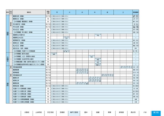 大阪校上本町校天王寺校京都校神戸三宮校豊中高槻堺東岸和田西大寺八木高3生映像講師山村・坂下藤川・西川山村・坂下藤川・西川一瀬・菱山佐河・阿部髙橋・打越佐河・阿部髙橋・打越ーー奥村・青木近藤・菅井重盛・松浦野村福永・伊藤・江ーーーーー木村・小野渡部・坂本佐々木・木村大髙・小松寺田・青野中村・小松向井・三浦牧島・西尾(健)乾・大學安達・西尾(源)唐牛・長井田島・松永加藤本瀬19:50〜21:20中田17:20〜18:50神坂19:10〜20:4019:10〜20:40神坂宮元19:10〜20:40伊藤(し)1月〜)18:40〜20:104月〜)18:40〜21:20乾1月〜)18:40〜20:104月〜)18:40〜21:20辻居1月〜)18:40〜20:104月〜)18:40〜21:20野黒美1月〜)18:40〜20:104月〜)18:40〜21:20古川1月〜)18:40〜20:104月〜)18:40〜21:20古川1月〜)18:40〜20:104月〜)18:40〜21:20宮路1月〜)18:40〜20:104月〜)18:40〜21:20乾90/150※ご都合にあわせてご視聴ください9060※ご都合にあわせてご視聴ください※ご都合にあわせてご視聴ください90/150※ご都合にあわせてご視聴ください90/150※ご都合にあわせてご視聴ください※ご都合にあわせてご視聴ください※ご都合にあわせてご視聴ください18:00〜19:30大村※ご都合にあわせてご視聴ください※ご都合にあわせてご視聴ください※ご都合にあわせてご視聴ください※ご都合にあわせてご視聴ください18:00〜19:30畑中・青野・八木17:20〜18:50加賀906090909090909090909090909090/15090/15090/15090/15090/15090/15090/15090/150※ご都合にあわせてご視聴ください909090909090※ご都合にあわせてご視聴ください※ご都合にあわせてご視聴ください※ご都合にあわせてご視聴ください※ご都合にあわせてご視聴ください※ご都合にあわせてご視聴ください※ご都合にあわせてご視聴ください難関古典(映像)難関古文(映像)【4月開講】難関漢文(映像)早大現代文(映像)早大古典(映像)早大古文(映像)【4月開講】早大漢文(映像)関関同立大現代文関関同立大古文標準現代文(映像)標準古文(映像)私大古文(映像)漢文文法・句形(映像)【4月開講】共通テスト対策国語【4月開講】医系小論文【4月開講】人文・教育系小論文【4月開講】社会科学系小論文【4月開講】看護・保健・歯学系小論文(オンライン授業)【4月開講】自然科学系小論文(オンライン授業)特別選抜物理難関物理標準物理特別選抜化学難関化学標準化学難関生物標準生物(映像)共通テスト対策物理(映像)共通テスト対策化学(映像)共通テスト対策生物(映像)共通テスト対策地学(映像)共通テスト対策物理基礎(映像)共通テスト対策化学基礎(映像)認定制--認定制-認定制-国語小論文理科神戸三宮教科申込区分講座名授業分数月火水木金土3ページ●2026年度/51/近畿/神戸三宮/高3・卒生/パターン6617/2026_51_5_514_11_20250817173134.csv校了時削除