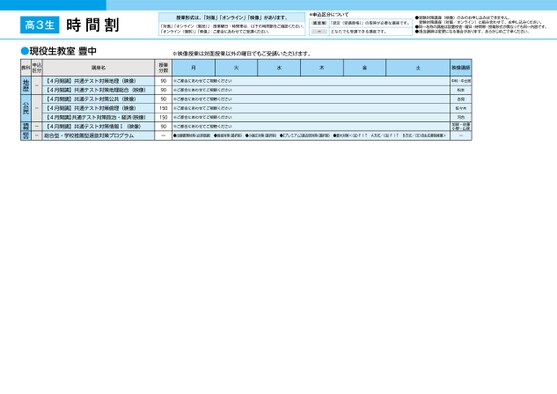 高3生時間割授業形式は、「対面」「オンライン」「映像」があります。「対面」「オンライン(集団)」:授業曜日・時間帯は、以下の時間割をご確認ください。「オンライン(個別)」「映像」:ご都合にあわせてご受講ください。*申込区分について認定制「認定(受講資格)」の取得が必要な講座です。ーどなたでも受講できる講座です。●受験対策講座(映像)のみのお申し込みはできません。受験対策講座(対面/オンライン)と組み合わせて、お申し込みください。●同一名称の講座は設置校舎・曜日・時間帯・授業形式が異なっても同一内容です。●担当講師は変更になる場合があります。あらかじめご了承ください。※映像授業は対面授業以外の曜日でもご受講いただけます。月火水木金土※ご都合にあわせてご視聴ください※ご都合にあわせてご視聴ください※ご都合にあわせてご視聴ください※ご都合にあわせてご視聴ください※ご都合にあわせてご視聴ください※ご都合にあわせてご視聴ください映像講師中村・中土居松本吉見佐々木河合加賀・佐藤竹内・山家●出願書類対策(必須受講)●面接対策(選択制)●小論文対策(選択制)●【プレミアム】過去問対策(選択制)●慶大対策<(法)FITA方式/(法)FITB方式/(文)自主応募制推薦>ー授業分数90909015015090ー【4月開講】共通テスト対策地理(映像)【4月開講】共通テスト対策地理総合(映像)【4月開講】共通テスト対策公共(映像)【4月開講】共通テスト対策倫理(映像)【4月開講】共通テスト対策政治・経済(映像)【4月開講】共通テスト対策情報Ⅰ(映像)総合型・学校推薦型選抜対策プログラム----地歴公民情報総合教科申込区分講座名豊中●現役生教室豊中5ページ●2026年度/51/近畿/豊中/高3・卒生/パターン6617/2026_51_5_563_11_20250817173134.csv校了時削除