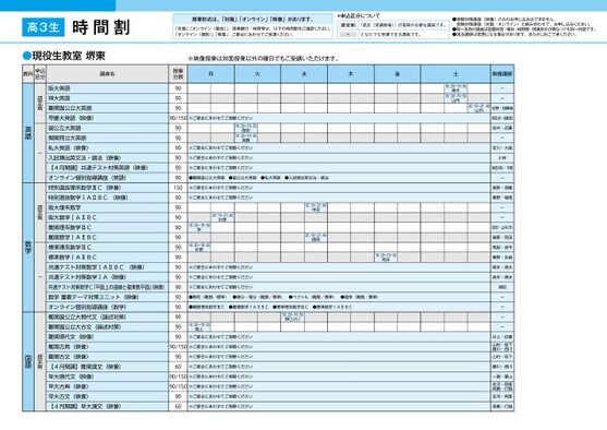 高3生時間割授業形式は、「対面」「オンライン」「映像」があります。「対面」「オンライン(集団)」:授業曜日・時間帯は、以下の時間割をご確認ください。「オンライン(個別)」「映像」:ご都合にあわせてご受講ください。*申込区分について認定制「認定(受講資格)」の取得が必要な講座です。ーどなたでも受講できる講座です。●受験対策講座(映像)のみのお申し込みはできません。受験対策講座(対面/オンライン)と組み合わせて、お申し込みください。●同一名称の講座は設置校舎・曜日・時間帯・授業形式が異なっても同一内容です。●担当講師は変更になる場合があります。あらかじめご了承ください。※映像授業は対面授業以外の曜日でもご受講いただけます。月火水木金土映像講師18:20〜19:5018:20〜19:50青木山内20:10〜21:40山内ーー佐野・胡摩﨑柴田(卓)・髙橋(慶)安井・近藤ー吉川・大島小林柴田(祐)・守屋ー樋原・須藤秦野・堀尾ーー依田・山本(洋)樋原・宮田高梨・波平秦野・永島森本・清水森本・清水湘田ーーーー井上・佐藤山村・坂下藤川・西川山村・坂下藤川・西川一瀬・菱山佐河・阿部髙橋・打越佐河・阿部髙橋・打越授業分数90909090/150※ご都合にあわせてご視聴ください90909090909018:20〜19:5018:20〜19:50西田加藤※ご都合にあわせてご視聴ください※ご都合にあわせてご視聴ください※ご都合にあわせてご視聴ください●難関国公立大英語●国公立大英語●私大英語●入試頻出英文法・語法150※ご都合にあわせてご視聴ください909090909090909090909090909090※ご都合にあわせてご視聴ください20:10〜21:40杉原18:20〜19:50岸18:20〜19:50杉原※ご都合にあわせてご視聴ください※ご都合にあわせてご視聴ください※ご都合にあわせてご視聴ください20:10〜21:40中田20:10〜21:40信岡18:20〜19:50池田●数列(難関/標準)●微分・積分(難関/標準)●ベクトル(難関/標準)●確率(難関/標準)●難関理系数学ⅢC●難関数学ⅠAⅡBC●標準理系数学ⅢC●標準数学ⅠAⅡBC18:20〜19:50阪上※ご都合にあわせてご視聴ください18:20〜19:50野口(た)90/150※ご都合にあわせてご視聴ください9060※ご都合にあわせてご視聴ください※ご都合にあわせてご視聴ください90/150※ご都合にあわせてご視聴ください90/150※ご都合にあわせてご視聴ください9060※ご都合にあわせてご視聴ください※ご都合にあわせてご視聴ください阪大英語神大英語難関国公立大英語早慶大英語(映像)国公立大英語関関同立大英語私大英語(映像)入試頻出英文法・語法(映像)【4月開講】共通テスト対策英語(映像)オンライン個別指導講座(英語)特別選抜理系数学ⅢC(映像)特別選抜数学ⅠAⅡBC(映像)阪大理系数学阪大数学ⅠAⅡBC難関理系数学ⅢC難関数学ⅠAⅡBC標準理系数学ⅢC標準数学ⅠAⅡBC共通テスト対策数学ⅠAⅡBC(映像)共通テスト対策数学ⅠA(映像)共通テスト対策数学C「平面上の曲線と複素数平面」映像)数学重要テーマ対策ユニット(映像)オンライン個別指導講座(数学)難関国公立大現代文(論述対策)難関国公立大古文(論述対策)難関現代文(映像)難関古典(映像)難関古文(映像)【4月開講】難関漢文(映像)早大現代文(映像)早大古典(映像)早大古文(映像)【4月開講】早大漢文(映像)認定制-認定制-英語数学認定制国語教科申込区分講座名堺東●現役生教室堺東1ページ●2026年度/51/近畿/堺東/高3・卒生/パターン6617/2026_51_5_533_11_20250817173134.csv校了時削除