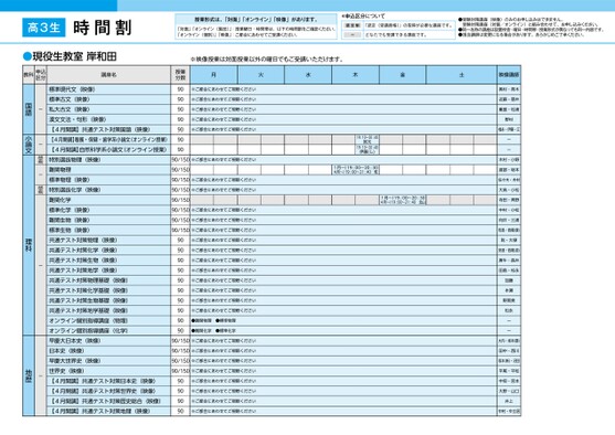 授業形式は、「対面」「オンライン」「映像」があります。「対面」「オンライン(集団)」:授業曜日・時間帯は、以下の時間割をご確認ください。「オンライン(個別)」「映像」:ご都合にあわせてご受講ください。*申込区分について認定制「認定(受講資格)」の取得が必要な講座です。ーどなたでも受講できる講座です。●受験対策講座(映像)のみのお申し込みはできません。受験対策講座(対面/オンライン)と組み合わせて、お申し込みください。●同一名称の講座は設置校舎・曜日・時間帯・授業形式が異なっても同一内容です。●担当講師は変更になる場合があります。あらかじめご了承ください。※映像授業は対面授業以外の曜日でもご受講いただけます。月火水木金土※ご都合にあわせてご視聴ください※ご都合にあわせてご視聴ください※ご都合にあわせてご視聴ください※ご都合にあわせてご視聴ください※ご都合にあわせてご視聴ください19:10〜20:40宮元19:10〜20:40伊藤(し)授業分数909090909090901月〜)19:00〜20:304月〜)19:00〜21:40乾1月〜)19:00〜20:304月〜)19:00〜21:40北山90/150※ご都合にあわせてご視聴ください90/15090/150※ご都合にあわせてご視聴ください90/150※ご都合にあわせてご視聴ください90/15090/150※ご都合にあわせてご視聴ください90/150※ご都合にあわせてご視聴ください90/150※ご都合にあわせてご視聴ください90909090909090909090※ご都合にあわせてご視聴ください※ご都合にあわせてご視聴ください※ご都合にあわせてご視聴ください※ご都合にあわせてご視聴ください※ご都合にあわせてご視聴ください※ご都合にあわせてご視聴ください※ご都合にあわせてご視聴ください※ご都合にあわせてご視聴ください●難関物理●標準物理●難関化学●標準化学90/150※ご都合にあわせてご視聴ください90/150※ご都合にあわせてご視聴ください90/150※ご都合にあわせてご視聴ください90/150※ご都合にあわせてご視聴ください90909090※ご都合にあわせてご視聴ください※ご都合にあわせてご視聴ください※ご都合にあわせてご視聴ください※ご都合にあわせてご視聴ください映像講師奥村・青木近藤・菅井重盛・松浦野村福永・伊藤・江ーー木村・小野渡部・坂本佐々木・木村大髙・小松寺田・青野中村・小松向井・三浦牧島・西尾(健)乾・大學安達・西尾(源)唐牛・長井田島・松永加藤本瀬野黒美松永ーー大内・坂本(勝)田中・西川坂本(新)・沼田平尾・平松中垣・宮本大野・山口井上中村・中土居標準現代文(映像)標準古文(映像)私大古文(映像)漢文文法・句形(映像)【4月開講】共通テスト対策国語(映像)【4月開講】看護・保健・歯学系小論文(オンライン授業)【4月開講】自然科学系小論文(オンライン授業)特別選抜物理(映像)難関物理標準物理(映像)特別選抜化学(映像)難関化学標準化学(映像)難関生物(映像)標準生物(映像)共通テスト対策物理(映像)共通テスト対策化学(映像)共通テスト対策生物(映像)共通テスト対策地学(映像)共通テスト対策物理基礎(映像)共通テスト対策化学基礎(映像)共通テスト対策生物基礎(映像)共通テスト対策地学基礎(映像)オンライン個別指導講座(物理)オンライン個別指導講座(化学)早慶大日本史(映像)日本史(映像)早慶大世界史(映像)世界史(映像)【4月開講】共通テスト対策日本史(映像)【4月開講】共通テスト対策世界史(映像)【4月開講】共通テスト対策歴史総合(映像)【4月開講】共通テスト対策地理(映像)--認定制-認定制-国語小論文理科-地歴教科申込区分講座名高3生時間割岸和田●現役生教室岸和田3ページ●2026年度/51/近畿/岸和田/高3・卒生/パターン6617/2026_51_5_564_11_20250817173134.csv校了時削除