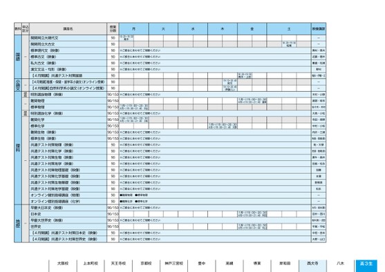 大阪校上本町校天王寺校京都校神戸三宮校豊中高槻堺東岸和田西大寺八木高3生火水木金土映像講師18:20〜19:50松尾18:20〜19:50青木・上田1月〜)19:00〜20:304月〜)19:00〜21:40瀧澤19:10〜20:40宮元19:10〜20:40伊藤(し)1月〜)19:00〜20:304月〜)19:00〜21:40大野1月〜)19:00〜20:304月〜)19:00〜21:40中田1月〜)19:00〜20:304月〜)19:00〜21:40大山ーー奥村・青木近藤・菅井重盛・松浦野村福永・伊藤・江ーー木村・小野渡部・坂本佐々木・木村大髙・小松寺田・青野中村・小松向井・三浦牧島・西尾(健)乾・大學安達・西尾(源)唐牛・長井田島・松永加藤本瀬野黒美松永ーー大内・坂本(勝)田中・西川坂本(新)・沼田平尾・平松中垣・宮本大野・山口月18:20〜19:50青木※ご都合にあわせてご視聴ください※ご都合にあわせてご視聴ください※ご都合にあわせてご視聴ください※ご都合にあわせてご視聴ください授業分数90909090909090909090/150※ご都合にあわせてご視聴ください90/15090/1501月〜)19:00〜20:304月〜)19:00〜21:40中出90/150※ご都合にあわせてご視聴ください1月〜)19:00〜20:304月〜)19:00〜21:40小松90/15090/15090/150※ご都合にあわせてご視聴ください90/150※ご都合にあわせてご視聴ください90909090909090909090※ご都合にあわせてご視聴ください※ご都合にあわせてご視聴ください※ご都合にあわせてご視聴ください※ご都合にあわせてご視聴ください※ご都合にあわせてご視聴ください※ご都合にあわせてご視聴ください※ご都合にあわせてご視聴ください※ご都合にあわせてご視聴ください●難関物理●標準物理●難関化学●標準化学90/150※ご都合にあわせてご視聴ください90/15090/150※ご都合にあわせてご視聴ください90/1509090※ご都合にあわせてご視聴ください※ご都合にあわせてご視聴ください関関同立大現代文関関同立大古文標準現代文(映像)標準古文(映像)私大古文(映像)漢文文法・句形(映像)【4月開講】共通テスト対策国語【4月開講】看護・保健・歯学系小論文(オンライン授業)【4月開講】自然科学系小論文(オンライン授業)特別選抜物理(映像)難関物理標準物理特別選抜化学(映像)難関化学標準化学難関生物(映像)標準生物(映像)共通テスト対策物理(映像)共通テスト対策化学(映像)共通テスト対策生物(映像)共通テスト対策地学(映像)共通テスト対策物理基礎(映像)共通テスト対策化学基礎(映像)共通テスト対策生物基礎(映像)共通テスト対策地学基礎(映像)オンライン個別指導講座(物理)オンライン個別指導講座(化学)早慶大日本史(映像)日本史早慶大世界史(映像)世界史【4月開講】共通テスト対策日本史(映像)【4月開講】共通テスト対策世界史(映像)-国語-認定制-認定制-小論文理科-地歴西大寺教科申込区分講座名3ページ●2026年度/51/近畿/西大寺/高3・卒生/パターン6617/2026_51_5_535_11_20250817173134.csv校了時削除
