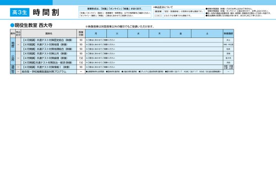 高3生時間割西大寺●現役生教室西大寺授業形式は、「対面」「オンライン」「映像」があります。「対面」「オンライン(集団)」:授業曜日・時間帯は、以下の時間割をご確認ください。「オンライン(個別)」「映像」:ご都合にあわせてご受講ください。*申込区分について認定制「認定(受講資格)」の取得が必要な講座です。ーどなたでも受講できる講座です。●受験対策講座(映像)のみのお申し込みはできません。受験対策講座(対面/オンライン)と組み合わせて、お申し込みください。●同一名称の講座は設置校舎・曜日・時間帯・授業形式が異なっても同一内容です。●担当講師は変更になる場合があります。あらかじめご了承ください。※映像授業は対面授業以外の曜日でもご受講いただけます。月火水木金土※ご都合にあわせてご視聴ください※ご都合にあわせてご視聴ください※ご都合にあわせてご視聴ください※ご都合にあわせてご視聴ください※ご都合にあわせてご視聴ください※ご都合にあわせてご視聴ください※ご都合にあわせてご視聴ください映像講師井上中村・中土居松本吉見佐々木河合加賀・佐藤竹内・山家●出願書類対策(必須受講)●面接対策(選択制)●小論文対策(選択制)●【プレミアム】過去問対策(選択制)●慶大対策<(法)FITA方式/(法)FITB方式/(文)自主応募制推薦>ー授業分数9090909015015090ー講座名【4月開講】共通テスト対策歴史総合(映像)【4月開講】共通テスト対策地理(映像)【4月開講】共通テスト対策地理総合(映像)【4月開講】共通テスト対策公共(映像)【4月開講】共通テスト対策倫理(映像)【4月開講】共通テスト対策政治・経済(映像)【4月開講】共通テスト対策情報Ⅰ(映像)総合型・学校推薦型選抜対策プログラム教科申込区分----地歴公民情報総合5ページ●2026年度/51/近畿/西大寺/高3・卒生/パターン6617/2026_51_5_535_11_20250817173134.csv校了時削除