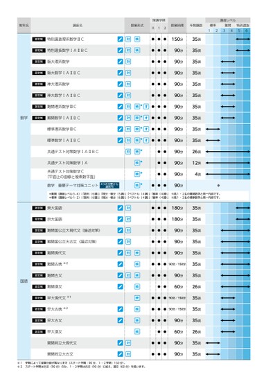 教科名講座名認定制特別選抜理系数学ⅢC認定制特別選抜数学ⅠAⅡBC認定制阪大理系数学認定制阪大数学ⅠAⅡBC認定制神大理系数学認定制神大数学ⅠAⅡBC認定制難関理系数学ⅢC数学認定制難関数学ⅠAⅡBC標準理系数学ⅢC標準数学ⅠAⅡBC共通テスト対策数学ⅠAⅡBC共通テスト対策数学ⅠA共通テスト対策数学C「平面上の曲線と複素数平面」数学重要テーマ対策ユニット4つの分野から選択可授業形式開講学期ス12授業時間年間講数標準難関1234特別選抜56講座レベル★★★★★★★★●●●150分●●●●●●●●●●●●●●●●●●●●●●●●●●●●●●●●●●●●90分90分90分90分90分90分90分90分90分90分90分90分90分35講35講35講35講35講35講35講35講35講35講26講12講4講**難関(講座レベル3-4):「数列(6講)」「微分・積分(5講)」「ベクトル(4講)」「確率(4講)」※高1・2生の難関数学と同一内容です。*標準(講座レベル1-2):「数列(6講)」「微分・積分(6講)」「ベクトル(4講)」「確率(4講)」※高1・2生の標準数学と同一内容です。認定制東大国語認定制京大国語認定制難関国公立大現代文(論述対策)認定制難関国公立大古文(論述対策)認定制難関現代文認定制難関古典※2国語認定制難関古文認定制難関漢文認定制早大現代文※1認定制早大古典※2認定制早大古文認定制早大漢文関関同立大現代文関関同立大古文●●●●●●●●●●●●●●●180分180分90分90分90分●●●90分/150分●●●●●90分60分●●●90分/150分●●●90分/150分●●●●●●●●●●●90分60分90分90分35講35講35講35講35講35講35講26講35講35講35講26講35講35講※1学期によって授業分数が異なります(スタート学期:90分、1・2学期:150分)。※2スタート学期は古文(90分)のみ、1・2学期は古文(90分)に加え、漢文(60分)を扱います。