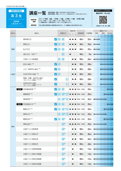 ※2026年4月から高3生の方対象受験対策講座高3生2026年1月スタート講座一覧受験対策講座(映像)のみのお申し込みはできません。受験対策講座(対面/オンライン)と組み合わせて、お申し込みください。Webサイトへアクセス!講座を探す・申し込む授業学期/講数授業時間スタート学期:9講、1学期:13講、2学期:13講〈年間35講〉※スタート学期:1〜3月/1学期:4〜7月/2学期:9〜12月※一部講座を除く。授業日程は67・68ページをご確認ください。下記に記載の授業時間に休憩時間は含みません。※一部講座には途中休憩があります。教科名講座名授業形式2025/11/6(木)公開講座レベル授業時間年間講数標準難関1234特別選抜56標準現代文標準古文私大古文国語漢文文法・句形※1共通テスト対策国語医系小論文※2人文・教育系小論文※2小論文社会科学系小論文※2看護・保健・歯学系小論文(オンライン授業)※2※3自然科学系小論文(オンライン授業)※2※3認定制特別選抜物理※4難関物理※4標準物理※4認定制特別選抜化学※4理科難関化学※4標準化学※4難関生物※4標準生物※4共通テスト対策物理共通テスト対策化学共通テスト対策生物共通テスト対策地学共通テスト対策物理基礎共通テスト対策化学基礎共通テスト対策生物基礎共通テスト対策地学基礎開講学期ス12●●●●●●●●●●●●●●●●●●●●●●90分90分90分90分90分90分90分90分90分90分●●●90分/150分●●●90分/150分●●●90分/150分●●●90分/150分●●●90分/150分●●●90分/150分●●●90分/150分●●●90分/150分●●●●●●●●●●●●90分90分90分90分90分90分90分90分★★★★★★★★★★★★★★35講35講35講9講26講28講28講28講28講28講35講35講35講35講35講35講35講35講26講26講26講26講13講13講13講13講