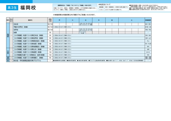 授業形式は、「対面」「オンライン」「映像」があります。「対面」「オンライン(集団)」:授業曜日・時間帯は、以下の時間割をご確認ください。「オンライン(個別)」「映像」:ご都合にあわせてご受講ください。*申込区分について認定制「認定(受講資格)」の取得が必要な講座です。ーどなたでも受講できる講座です。●受験対策講座(映像)のみのお申し込みはできません。受験対策講座(対面/オンライン)と組み合わせて、お申し込みください。●同一名称の講座は設置校舎・曜日・時間帯・授業形式が異なっても同一内容です。●担当講師は変更になる場合があります。あらかじめご了承ください。※映像授業は対面授業以外の曜日でもご受講いただけます。月火水木金土映像講師田中・西川坂本(新)・沼田平尾・平松-中垣・宮本大野・山口井上中村・中土居松本吉見佐々木河合加賀・佐藤小野竹内・山家●出願書類対策(必須受講)●面接対策(選択制)●小論文対策(選択制)●【プレミアム】過去問対策(選択制)●慶大対策<(法)FITA方式/(法)FITB方式/(文)自主応募制推薦>-1月〜)19:10〜20:404月〜)18:30〜21:10梅野1月〜)19:10〜20:404月〜)18:30〜21:10下川19:10〜20:40中土居90/150※ご都合にあわせてご視聴ください90/150※ご都合にあわせてご視聴ください※ご都合にあわせてご視聴ください※ご都合にあわせてご視聴ください※ご都合にあわせてご視聴ください※ご都合にあわせてご視聴ください※ご都合にあわせてご視聴ください※ご都合にあわせてご視聴ください※ご都合にあわせてご視聴ください※ご都合にあわせてご視聴ください授業分数90/1509090909090909015015090-日本史早慶大世界史(映像)世界史地理【4月開講】共通テスト対策日本史(映像)【4月開講】共通テスト対策世界史(映像)【4月開講】共通テスト対策歴史総合(映像)【4月開講】共通テスト対策地理(映像)【4月開講】共通テスト対策地理総合(映像)【4月開講】共通テスト対策公共(映像)【4月開講】共通テスト対策倫理(映像)【4月開講】共通テスト対策政治・経済(映像)【4月開講】共通テスト対策情報Ⅰ(映像)総合型・学校推薦型選抜対策プログラム-地歴---公民情報総合教科申込区分講座名福岡校高3生福岡校5ページ●2026年度/51/九州/福岡校/高3・卒生/パターン6617/2026_51_7_711_11_20250808164932.csv校了時削除
