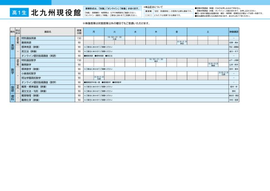 授業形式は、「対面」「オンライン」「映像」があります。授業形式は、「対面」「オンライン「映像」があります。「対面」:授業曜日・時間帯は、以下の時間割をご確認ください。「対面」「オンライン(集団)」:授業曜帯は下の時間割をご確認ください。「オンライン(個別)」「映像」:ご都合にあわせてご受講ください。「オンライン(個別)「映像」ご都合にあわせてご受講くだい。ー*申込区分について*申込区分について認定制「認定(受講資格)」の取得が必要な講座です。「認定(受講資格)」の取得が必要な講座です。認定制どなたでも受講できる講座です。どなたでも受講できる講座です。ー●受験対策講座(映像)のみのお申し込みはできません。受験対策講座(対面/オンライン)と組み合わせて、お申し込みください。●同一名称の講座は設置校舎・曜日・時間帯・授業形式が異なっても同一内容です。●担当講師は変更になる場合があります。あらかじめご了承ください。映像)のみのお申し込みはできません。受験対策講座(対面/オンライン)と組み合わせて、お申し込みください。●同一名称の講座は設置校舎・曜日・時間帯・授業形式が異なっても同一内容です。●担当講師は変更になる場合があります。あらかじめご了承ください。※映像授業は対面授業以外の曜日でもご受講いただけます。月火水木金土18:50〜21:30久我※ご都合にあわせてご視聴ください※ご都合にあわせてご視聴ください●難関英語●標準英語●英文法※ご都合にあわせてご視聴ください20:00〜21:30家田18:50〜21:30清水20:00〜21:30石原●難関数学中高一貫●難関数学●標準数学※ご都合にあわせてご視聴ください※ご都合にあわせてご視聴ください※ご都合にあわせてご視聴ください※ご都合にあわせてご視聴ください18:00〜19:30真崎20:00〜21:30石原映像講師-佐野・清水市位・胡摩﨑成川・木下-山下・上高原山本・府木田中・塚本---畑中・仲野村長谷川・原田中村・若原高2生高3生北九州現役館北九州現役館授業分数15090909090150909090909090909090特別選抜英語難関英語標準英語(映像)英文法(映像)オンライン個別指導講座(英語)特別選抜数学難関数学標準数学(映像)小倉高校数学明治学園高校数学オンライン個別指導講座(数学)難関・標準国語(映像)漢文文法・句形(映像)難関物理(映像)難関化学(映像)認定制-認定制-認定制--英語数学国語理科教科申込区分講座名1ページ●2026年度/51/九州/北九州現役館/高1生/パターン6617/2026_51_7_745_31_20250808135532.csv校了時削除
