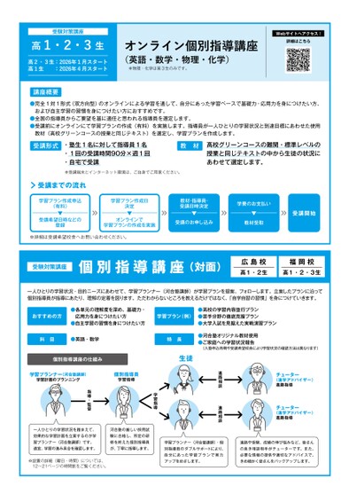 受験対策講座高1・2・3生高2・3生:2026年1月スタート高1生:2026年4月スタート講座概要オンライン個別指導講座(英語・数学・物理・化学)※物理・化学は高3生のみです。Webサイトへアクセス!詳細はこちら●完全1対1形式(双方向型)のオンラインによる学習を通して、自分にあった学習ペースで基礎力・応用力を身につけたい方、および自主学習の習慣を身につけたい方におすすめです。●全国の指導員からご要望を基に適任と思われる指導員を選定します。●受講前にオンラインにて学習プランの作成(有料)を実施します。指導員が一人ひとりの学習状況と到達目標にあわせた使用教材(高校グリーンコースの授業と同じテキスト)を選定し、学習プランを作成します。受講形式・塾生1名に対して指導員1名・1回の受講時間90分×週1回・自宅で受講教材高校グリーンコースの難関・標準レベルの授業と同じテキストの中から生徒の状況にあわせて選定します。※受講端末とインターネット環境は、ご自身でご用意ください。受講までの流れ学習プラン作成申込〈有料〉学習プラン作成日決定教材・指導員・受講日時決定学費のお支払い受講希望日時などの登録オンラインで学習プランの作成を実施受講のお申し込み教材受取受講開始※詳細は受講希望校舎へお問い合わせください。受験対策講座個別指導講座(対面)広島校高1・2生福岡校高1・2・3生一人ひとりの学習状況・目的ニーズにあわせて、学習プランナー(河合塾講師)が学習プランを提案、フォローします。立案したプランに沿って個別指導員が指導にあたり、理解の定着を図ります。ただわからないところを教えるだけではなく、「自学自習の習慣」を身につけていきます。おすすめの方●各単元の理解度を深め、基礎力・応用力を身につけたい方●自主学習の習慣を身につけたい方学習プラン(例)●高校の学習内容並行プラン●苦手分野の徹底克服プラン●大学入試を見据えた実戦演習プランチューター(進学アドパイザー)進路指導チューター(進学アドパイザー)進路指導進路相談進路相談●河合塾オリジナル教材使用●ご家庭への学習状況報告(入塾申込時期や受講希望校舎により学習状況の確認方法は異なります)特長生徒学習プランナー(河合塾講師)・個別指導員のダブルサポートにより、自分にあった学習プランで実力アップをめざします。進路や受験、成績の伸び悩みなど、皆さんの良き相談相手がチューターです。また、必要な情報の提供や適切なアドバイスで、きめ細かく皆さんをバックアップします。学習指導指導・監督科目●英語・数学個別指導講座の仕組み学習プランナー(河合塾講師)学習計画のプランニング個別指導員学習指導一人ひとりの学習状況を踏まえて、効果的な学習計画を立案するのが学習プランナー(河合塾講師)です。適宜、学習の進み具合を確認します。河合塾の厳しい採用試験に合格し、所定の研修を終えた個別指導員が、丁寧に指導します。※設置の詳細(曜日・時間)については、12〜21ページの時間割をご覧ください。