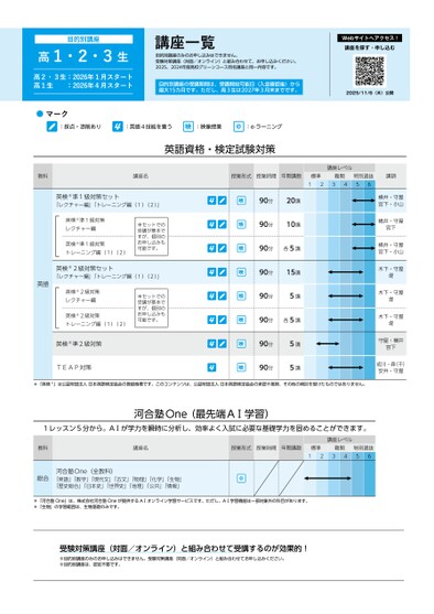 目的別講座高1・2・3生高2・3生:2026年1月スタート高1生:2026年4月スタート●マーク講座一覧目的別講座のみのお申し込みはできません。受験対策講座(対面/オンライン)と組み合わせて、お申し込みください。2025、2024年度高校グリーンコース同名講座と同一内容です。Webサイトへアクセス!講座を探す・申し込む目的別講座の受講期間は、受講開始可能日(入金確認後)から最大15カ月です。ただし、高3生は2027年3月末までです。2025/11/6(木)公開:採点・添削あり:英語4技能を養う:映像授業:e-ラーニング英語資格・検定試験対策教科講座名授業形式授業時間年間講数標準難関1234特別選抜56講師講座レベル英検®準1級対策セット「レクチャー編」「トレーニング編(1)(2)」英検®準1級対策レクチャー編英検®準1級対策トレーニング編(1)(2)※セットでの受講が基本ですが、個別のお申し込みも可能です。英検®2級対策セット「レクチャー編」「トレーニング編(1)(2)」英検®2級対策レクチャー編英検®2級対策トレーニング編(1)(2)※セットでの受講が基本ですが、個別のお申し込みも可能です。英語英検®準2級対策TEAP対策90分20講90分10講90分各5講90分15講90分5講90分各5講90分90分5講5講横井・守屋宮下・小山横井・守屋宮下横井・守屋宮下・小山木下・守屋堤木下・守屋堤木下・守屋堤守屋・横井宮下成川・森(千)安井・守屋*「英検®」は公益財団法人日本英語検定協会の登録商標です。このコンテンツは、公益財団法人日本英語検定協会の承認や推奨、その他の検討を受けたものではありません。1レッスン5分から。AⅠが学力を瞬時に分析し、効率よく入試に必要な基礎学力を固めることができます。河合塾One(最先端AⅠ学習)教科総合講座名授業形式授業時間年間講数標準難関1234特別選抜56講座レベル河合塾One(全教科)「英語」「数学」「現代文」「古文」「物理」「化学」「生物」「歴史総合」「日本史」「世界史」「地理」「公共」「情報」*「河合塾One」は、株式会社河合塾Oneが提供するAⅠオンライン学習サービスです。ただし、AⅠ学習機能は一部対象外の科目があります。*「生物」の学習範囲は、生物基礎のみです。受験対策講座(対面/オンライン)と組み合わせて受講するのが効果的!※目的別講座のみのお申し込みはできません。受験対策講座(対面/オンライン)と組み合わせてお申し込みください。※目的別講座は、認定不要です。
