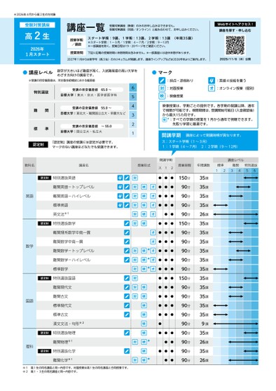 ※2026年4月から高2生の方対象受験対策講座高2生2026年1月スタート講座一覧受験対策講座(映像)のみのお申し込みはできません。受験対策講座(対面/オンライン)と組み合わせて、お申し込みください。Webサイトへアクセス!講座を探す・申し込む授業学期/講数授業時間スタート学期:9講、1学期:13講、2学期:13講〈年間35講〉※スタート学期:1〜3月/1学期:4〜7月/2学期:9〜12月※一部講座を除く。授業日程は19・20ページをご確認ください。下記に記載の授業時間に休憩時間は含みません。※一部講座には途中休憩があります。2027年1月からは新学年(高3生)のカリキュラムが開講します。講座ラインアップなどは2026年秋よりご案内します。2025/11/6(木)公開●講座レベル数字が大きいほど難度が高く、入試難易度の高い大学をめざす方向けの講座です。※受講の目安偏差値は、河合塾全統模試における偏差値特別選抜受講の目安偏差値65.0〜目標大学:東大・京大・医学部医学科難関受講の目安偏差値55.0〜目標大学:東北大・難関国公立大・早慶大など標準受講の目安偏差値〜55.0目標大学:国公立大・私立大認定制「認定制」講座の受講には認定が必要です。マークのない講座はどなたでも受講できます。654321●マーク:採点・添削あり:英語4技能を養う:対面授業:映像授業:オンライン授業(個別)映像授業は、学期ごとの提供です。各学期の開講以降、通年で視聴が可能です。視聴期間は、受講開始可能日(入金確認後)から最大15カ月です。:すべての学期の授業を1月から通年で視聴できます。★先取り学習に最適です。開講学期講座によって開講時期が異なります。ス:スタート学期(1〜3月)1:1学期(4〜7月)2:2学期(9〜12月)授業形式開講学期ス12授業時間年間講数標準難関1234特別選抜56講座レベル教科名講座名認定制特別選抜英語難関英語-トップレベル英語難関英語-ハイレベル標準英語英文法※1認定制特別選抜数学数学国語理科難関理系数学中高一貫難関数学中高一貫難関数学-トップレベル難関数学-ハイレベル標準数学認定制特別選抜国語難関現代文難関古文標準現代文標準古文漢文文法・句形※2認定制特別選抜物理難関物理※1認定制特別選抜化学難関化学※1★★★★★●●●●●●●●●●●●●●●●●●●●●●●●●●●●●●●●●●●●●●●●●●●●●●●●●●●●●●●●●●150分90分90分90分90分150分90分90分90分90分90分150分90分90分90分90分90分90分90分90分90分35講35講35講35講26講35講35講35講35講35講35講35講35講35講35講35講9講35講26講35講26講※1高1生の同名講座と同一内容です。対面授業は高1生の同名講座と合同授業です。※2高1・3生の同名講座と同一内容です。