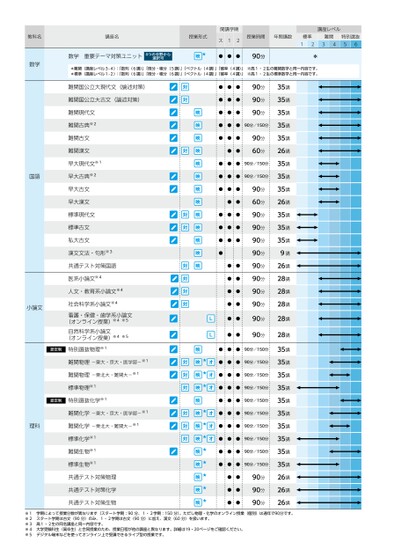 講座名授業形式開講学期ス12授業時間年間講数標準難関1234特別選抜56講座レベル数学重要テーマ対策ユニット4つの分野から選択可★●●●90分**難関(講座レベル3-4):「数列(6講)」「微分・積分(5講)」「ベクトル(4講)」「確率(4講)」※高1・2生の難関数学と同一内容です。*標準(講座レベル1-2):「数列(6講)」「微分・積分(6講)」「ベクトル(4講)」「確率(4講)」※高1・2生の標準数学と同一内容です。教科名数学国語小論文難関国公立大現代文(論述対策)難関国公立大古文(論述対策)難関現代文難関古典※2難関古文難関漢文早大現代文※1早大古典※2早大古文早大漢文標準現代文標準古文私大古文漢文文法・句形※3共通テスト対策国語医系小論文※4人文・教育系小論文※4社会科学系小論文※4看護・保健・歯学系小論文(オンライン授業)※4※5自然科学系小論文(オンライン授業)※4※5認定制特別選抜物理※1難関物理-東大・京大・医学部-※1難関物理-東北大・難関大-※1標準物理※1認定制特別選抜化学※1難関化学-東大・京大・医学部-※1理科難関化学-東北大・難関大-※1標準化学※1難関生物※1標準生物※1共通テスト対策物理共通テスト対策化学共通テスト対策生物●●●●●●●●●●●●●●●●●●●●●●●●●●●●●●●●●●●●●●●●●●●●●●●●●●●●●●●●●●●●90分90分90分90分/150分90分60分90分/150分90分/150分90分60分90分90分90分90分90分90分90分90分90分90分●●●●●●●●●●●●●●●●●●●●●●●●●●90分/150分90分/150分90分/150分90分/150分90分/150分90分/150分90分/150分90分/150分90分/150分90分/150分90分90分90分35講35講35講35講35講26講35講35講35講26講35講35講35講9講26講28講28講28講28講28講35講35講35講35講35講35講35講35講35講35講26講26講26講★★★★★★★★★★★※1学期によって授業分数が異なります(スタート学期:90分、1・2学期:150分)。ただし物理・化学のオンライン授業(個別)は通年で90分です。※2スタート学期は古文(90分)のみ、1・2学期は古文(90分)に加え、漢文(60分)を扱います。※3高1・2生の同名講座と同一内容です。※4大学受験科生(高卒生)と合同授業のため、授業日程が他の講座と異なります。詳細は19・20ページをご確認ください。※5デジタル端末などを使ってオンライン上で受講できるライブ型の授業です。