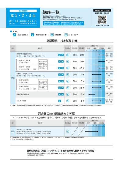 目的別講座高1・2・3生高2・3生:2026年1月スタート高1生:2026年4月スタート講座一覧目的別講座のみのお申し込みはできません。受験対策講座(対面/オンライン)と組み合わせて、お申し込みください。2025、2024年度高校グリーンコース同名講座と同一内容です。目的別講座の受講期間は、受講開始可能日(入金確認後)から最大15カ月です。ただし、高3生は2027年3月末までです。Webサイトへアクセス!講座を探す・申し込む2025/11/6(木)公開●マーク:採点・添削あり:英語4技能を養う:映像授業:e-ラーニング英語資格・検定試験対策教科講座名授業形式授業時間年間講数標準難関1234特別選抜56講師講座レベル英検®準1級対策セット「レクチャー編」「トレーニング編(1)(2)」英検®準1級対策レクチャー編英検®準1級対策トレーニング編(1)(2)※セットでの受講が基本ですが、個別のお申し込みも可能です。英検®2級対策セット「レクチャー編」「トレーニング編(1)(2)」英検®2級対策レクチャー編英検®2級対策トレーニング編(1)(2)※セットでの受講が基本ですが、個別のお申し込みも可能です。英語英検®準2級対策TEAP対策90分20講90分10講90分各5講90分15講90分5講90分各5講90分5講90分5講横井・守屋宮下・小山横井・守屋宮下横井・守屋宮下・小山木下・守屋堤木下・守屋堤木下・守屋堤守屋・横井宮下成川・森(千)安井・守屋*「英検®」は公益財団法人日本英語検定協会の登録商標です。このコンテンツは、公益財団法人日本英語検定協会の承認や推奨、その他の検討を受けたものではありません。1レッスン5分から。AⅠが学力を瞬時に分析し、効率よく入試に必要な基礎学力を固めることができます。河合塾One(最先端AⅠ学習)教科総合講座名授業形式授業時間年間講数標準難関1234特別選抜56講座レベル河合塾One(全教科)「英語」「数学」「現代文」「古文」「物理」「化学」「生物」「歴史総合」「日本史」「世界史」「地理」「公共」「情報」*「河合塾One」は、株式会社河合塾Oneが提供するAⅠオンライン学習サービスです。ただし、AⅠ学習機能は一部対象外の科目があります。*「生物」の学習範囲は、生物基礎のみです。受験対策講座(対面/オンライン)と組み合わせて受講するのが効果的!※目的別講座のみのお申し込みはできません。受験対策講座(対面/オンライン)と組み合わせてお申し込みください。※目的別講座は、認定不要です。