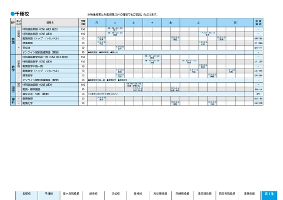映像講師--佐野・清水市位・胡摩﨑成川・木下--山下・上高原-山本・府木田中・塚本--畑中・仲野村長谷川・原田中村・若原※映像授業は対面授業以外の曜日でもご受講いただけます。月火水木金土日18:10〜20:5018:10〜20:50宮下岩崎19:20〜20:0百々19:20〜20:50深津19:20〜20:50笠井●難関英語●標準英語●英文法18:10〜20:5018:10〜20:50宮田水嶋19:20〜20:0宮田19:20〜20:0河合●標準数学●難関数学中高一貫●難関数学18:00〜20:50安達・伊藤(さ)19:0〜20:50渡辺・鈴木(孝)※ご都合にあわせてご視聴ください19:20〜20:50坂本19:0〜20:0塚田17:30〜20:10登木17:30〜19:00山本09:30〜11:0長瀬14:30〜17:10西畑15:40〜17:10河合17:30〜19:00野村11:0〜12:0三輪19:20〜20:50後藤19:0〜20:0佐藤・横井19:0〜20:0青野19:20〜20:50大髙授業分数150150909090901501509090909015090909090特別選抜英語(ONEWEX総合)特別選抜英語(ONEWEX)難関英語(トップ・ハイレベル)標準英語英文法オンライン個別指導講座(英語)特別選抜数学中高一貫(ONEWEX総合)特別選抜数学(ONEWEX)難関数学中高一貫難関数学(トップ・ハイレベル)標準数学オンライン個別指導講座(数学)特別選抜国語(ONEWEX)難関・標準国語漢文文法・句形(映像)難関物理難関化学認定制-認定制-認定制---英語数学国語理科●千種校教科申込区分講座名名駅校千種校星ヶ丘現役館岐阜校浜松校豊橋校刈谷現役館岡崎現役館豊田現役館四日市現役館津現役館高1生