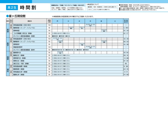授業形式は、「対面」「オンライン」「映像」があります。「対面」:授業曜日・時間帯は、以下の時間割をご確認ください。「オンライン(個別)」「映像」:ご都合にあわせてご受講ください。*申込区分について認定制「認定(受講資格)」の取得が必要な講座です。ーどなたでも受講できる講座です。●受験対策講座(映像)のみのお申し込みはできません。受験対策講座(対面/オンライン)と組み合わせて、お申し込みください。●同一名称の講座は設置校舎・曜日・時間帯・授業形式が異なっても同一内容です。●担当講師は変更になる場合があります。あらかじめご了承ください。※映像授業は対面授業以外の曜日でもご受講いただけます。月火水木金土19:0〜20:0渡部19:0〜20:0加藤19:20〜20:0桑野20:0〜21:30青木18:50〜21:30松岡※ご都合にあわせてご視聴ください●難関英語●標準英語●英文法18:50〜21:30小栗19:20〜20:50吉嗣19:0〜20:50斉藤19:00〜21:10三輪●難関理系数学中高一貫●難関数学中高一貫●難関数学●標準数学19:20〜20:50平野※ご都合にあわせてご視聴ください※ご都合にあわせてご視聴ください※ご都合にあわせてご視聴ください※ご都合にあわせてご視聴ください※ご都合にあわせてご視聴ください※ご都合にあわせてご視聴ください※ご都合にあわせてご視聴ください※ご都合にあわせてご視聴ください授業分数15090909090150909012090909090909090909090映像講師-村上・髙橋(保)成川・大島成川・木下-大庭・水嶋依田・合田河合・吉嗣--光田・清水伊藤(さ)・菅井一路・斎藤田中・酒井野村乾・窪田長谷川・原田金・原中村・若原高2生時間割特別選抜英語(ONEWEX)難関英語(トップ・ハイレベル)標準英語【4月開講】英文法(映像)オンライン個別指導講座(英語)特別選抜数学(ONEWEX)難関数学(トップ・ハイレベル)標準数学菊里高校数学オンライン個別指導講座(数学)難関現代文難関古文(映像)標準現代文(映像)標準古文(映像)漢文文法・句形(映像)特別選抜物理(映像)難関物理(映像)特別選抜化学(映像)難関化学(映像)認定制-認定制-認定制-認定制-認定制-英語数学国語理科●星ヶ丘現役館教科申込区分講座名
