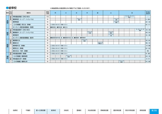 19:20〜20:50川野19:20〜20:50村瀬日13:30〜16:10盧山16:40〜19:20西畑映像講師-村上・髙橋(保)成川・大島成川・木下-大庭・水嶋依田・合田河合・吉嗣-光田・清水伊藤(さ)・菅井一路・斎藤田中・酒井野村乾・窪田長谷川・原田金・原中村・若原11:00〜12:0若原※映像授業は対面授業以外の曜日でもご受講いただけます。月火水木金土※ご都合にあわせてご視聴ください●難関英語●標準英語●英文法19:0〜21:20室田19:50〜21:20小栗●難関理系数学中高一貫●難関数学中高一貫●難関数学●標準数学18:00〜19:30佐藤19:0〜21:0伊藤(さ)※ご都合にあわせてご視聴ください※ご都合にあわせてご視聴ください※ご都合にあわせてご視聴ください※ご都合にあわせてご視聴ください19:50〜21:0西浦※ご都合にあわせてご視聴ください17:20〜18:50宮田17:20〜18:50小田授業分数15090909090150909090909090909090909090特別選抜英語(ONEWEX)難関英語(トップ・ハイレベル)標準英語【4月開講】英文法(映像)オンライン個別指導講座(英語)特別選抜数学(ONEWEX)難関数学(トップ・ハイレベル)標準数学オンライン個別指導講座(数学)難関現代文難関古文標準現代文(映像)標準古文(映像)漢文文法・句形(映像)特別選抜物理(映像)【4月開講】難関物理特別選抜化学(映像)【4月開講】難関化学認定制-認定制-認定制-認定制-認定制-英語数学国語理科●岐阜校教科申込区分講座名名駅校千種校星ヶ丘現役館岐阜校浜松校豊橋校刈谷現役館岡崎現役館豊田現役館四日市現役館津現役館高2生