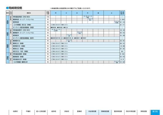 名駅校千種校星ヶ丘現役館岐阜校浜松校豊橋校刈谷現役館岡崎現役館豊田現役館四日市現役館津現役館高2生※映像授業は対面授業以外の曜日でもご受講いただけます。月火水木金土18:30〜21:10伊藤20:00〜21:30青木※ご都合にあわせてご視聴ください●難関英語●標準英語●英文法授業分数1509090909015018:30〜21:10山田(勝)20:0〜21:30河合19:30〜21:0江澤●難関理系数学中高一貫●難関数学中高一貫●難関数学●標準数学19:30〜21:0渡辺※ご都合にあわせてご視聴ください※ご都合にあわせてご視聴ください※ご都合にあわせてご視聴ください※ご都合にあわせてご視聴ください※ご都合にあわせてご視聴ください※ご都合にあわせてご視聴ください※ご都合にあわせてご視聴ください909090909090909090909090映像講師-村上・髙橋(保)成川・大島成川・木下-大庭・水嶋依田・合田河合・吉嗣-光田・清水伊藤(さ)・菅井一路・斎藤田中・酒井野村乾・窪田長谷川・原田金・原中村・若原19:30〜21:00森(康)20:00〜21:30若原特別選抜英語(ONEWEX)難関英語(トップ・ハイレベル)標準英語【4月開講】英文法(映像)オンライン個別指導講座(英語)特別選抜数学(ONEWEX)難関数学(トップ・ハイレベル)標準数学オンライン個別指導講座(数学)難関現代文難関古文(映像)標準現代文(映像)標準古文(映像)漢文文法・句形(映像)特別選抜物理(映像)難関物理(映像)特別選抜化学(映像)【4月開講】難関化学認定制-認定制-認定制-認定制-認定制-英語数学国語理科●岡崎現役館教科申込区分講座名