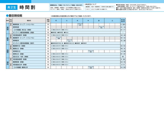 授業形式は、「対面」「オンライン」「映像」があります。「対面」:授業曜日・時間帯は、以下の時間割をご確認ください。「オンライン(個別)」「映像」:ご都合にあわせてご受講ください。*申込区分について認定制「認定(受講資格)」の取得が必要な講座です。ーどなたでも受講できる講座です。●受験対策講座(映像)のみのお申し込みはできません。受験対策講座(対面/オンライン)と組み合わせて、お申し込みください。●同一名称の講座は設置校舎・曜日・時間帯・授業形式が異なっても同一内容です。●担当講師は変更になる場合があります。あらかじめご了承ください。※映像授業は対面授業以外の曜日でもご受講いただけます。月火水木金土20:0〜21:30山本20:0〜21:0盧山※ご都合にあわせてご視聴ください●難関英語●標準英語●英文法授業分数90909090150※ご都合にあわせてご視聴ください20:00〜21:30加藤20:00〜21:0山上●難関理系数学中高一貫●難関数学中高一貫●難関数学●標準数学※ご都合にあわせてご視聴ください※ご都合にあわせてご視聴ください※ご都合にあわせてご視聴ください※ご都合にあわせてご視聴ください※ご都合にあわせてご視聴ください※ご都合にあわせてご視聴ください※ご都合にあわせてご視聴ください90909090909090909090909020:00〜21:30渡辺19:30〜21:00若原映像講師村上・髙橋(保)成川・大島成川・木下-大庭・水嶋依田・合田河合・吉嗣-光田・清水伊藤(さ)・菅井一路・斎藤田中・酒井野村乾・窪田長谷川・原田金・原中村・若原高2生時間割難関英語(トップ・ハイレベル)標準英語【4月開講】英文法(映像)オンライン個別指導講座(英語)特別選抜数学(映像)難関数学(トップ・ハイレベル)標準数学オンライン個別指導講座(数学)難関現代文(映像)難関古文(映像)標準現代文標準古文(映像)漢文文法・句形(映像)特別選抜物理(映像)難関物理(映像)特別選抜化学(映像)【4月開講】難関化学認定制-認定制-認定制-認定制-認定制-英語数学国語理科●豊田現役館教科申込区分講座名