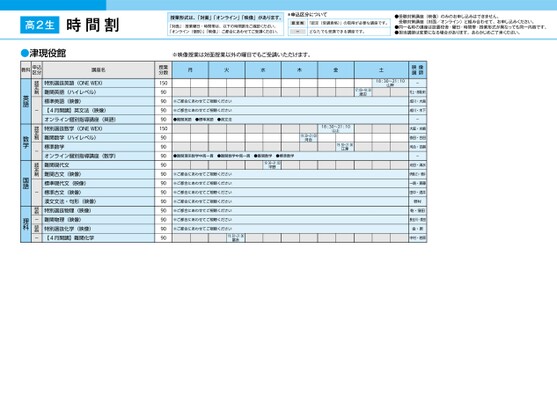 授業形式は、「対面」「オンライン」「映像」があります。「対面」:授業曜日・時間帯は、以下の時間割をご確認ください。「オンライン(個別)」「映像」:ご都合にあわせてご受講ください。*申込区分について認定制「認定(受講資格)」の取得が必要な講座です。ーどなたでも受講できる講座です。●受験対策講座(映像)のみのお申し込みはできません。受験対策講座(対面/オンライン)と組み合わせて、お申し込みください。●同一名称の講座は設置校舎・曜日・時間帯・授業形式が異なっても同一内容です。●担当講師は変更になる場合があります。あらかじめご了承ください。※映像授業は対面授業以外の曜日でもご受講いただけます。月火水木金土18:30〜21:10山岸17:0〜18:30渡辺19:30〜21:00河合18:30〜21:10山上19:0〜21:0江澤※ご都合にあわせてご視聴ください※ご都合にあわせてご視聴ください●難関英語●標準英語●英文法●難関理系数学中高一貫●難関数学中高一貫●難関数学●標準数学19:0〜21:00平野※ご都合にあわせてご視聴ください※ご都合にあわせてご視聴ください※ご都合にあわせてご視聴ください※ご都合にあわせてご視聴ください※ご都合にあわせてご視聴ください※ご都合にあわせてご視聴ください※ご都合にあわせてご視聴ください19:30〜21:0冨永授業分数15090909090150909090909090909090909090映像講師-村上・髙橋(保)成川・大島成川・木下-大庭・水嶋依田・合田河合・吉嗣-光田・清水伊藤(さ)・菅井一路・斎藤田中・酒井野村乾・窪田長谷川・原田金・原中村・若原高2生時間割特別選抜英語(ONEWEX)難関英語(ハイレベル)標準英語(映像)【4月開講】英文法(映像)オンライン個別指導講座(英語)特別選抜数学(ONEWEX)難関数学(ハイレベル)標準数学オンライン個別指導講座(数学)難関現代文難関古文(映像)標準現代文(映像)標準古文(映像)漢文文法・句形(映像)特別選抜物理(映像)難関物理(映像)特別選抜化学(映像)【4月開講】難関化学認定制-認定制-認定制-認定制-認定制-英語数学国語理科●津現役館教科申込区分講座名