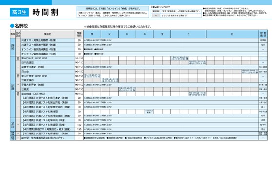 授業形式は、「対面」「オンライン」「映像」があります。「対面」「オンライン(集団)」:授業曜日・時間帯は、以下の時間割をご確認ください。「オンライン(個別)」「映像」:ご都合にあわせてご受講ください。*申込区分について認定制「認定(受講資格)」の取得が必要な講座です。ーどなたでも受講できる講座です。●受験対策講座(映像)のみのお申し込みはできません。受験対策講座(対面/オンライン)と組み合わせて、お申し込みください。●同一名称の講座は設置校舎・曜日・時間帯・授業形式が異なっても同一内容です。●担当講師は変更になる場合があります。あらかじめご了承ください。※映像授業は対面授業以外の曜日でもご受講いただけます。月火水木金土日※ご都合にあわせてご視聴ください※ご都合にあわせてご視聴ください●難関物理●標準物理●難関化学●標準化学1月〜)15:30〜174月〜)14:20〜17:00:00平野1月〜)17:30〜19:004月〜)17:30〜20:10平野1月〜)17:30〜19:04月〜)17:30〜20:100酒井授業分数9090909090/15090/15090/150※ご都合にあわせてご視聴ください90/15090/15090/1501月〜)19:40〜21:104月〜)18:30〜21:10平松1月〜)19:40〜21:104月〜)18:30〜21:10堤90/150※ご都合にあわせてご視聴ください90/15090/15090909090909015015090ー1月〜)19:40〜214月〜)18:30〜21:10:10平松1月〜)17:30〜19:004月〜)17:30〜20:10松本19:0〜21:20松本※ご都合にあわせてご視聴ください※ご都合にあわせてご視聴ください※ご都合にあわせてご視聴ください※ご都合にあわせてご視聴ください※ご都合にあわせてご視聴ください※ご都合にあわせてご視聴ください※ご都合にあわせてご視聴ください※ご都合にあわせてご視聴ください●出願書類対策(必須受講)●面接対策(選択制)●小論文対策(選択制)●【プレミアム】過去問対策(選択制)●慶大対策<(法)FITA方式/(法)FITB方式/(文)自主応募制推薦>映像講師野黒美松永ーーーー大内・坂本(勝)田中・西川ーー坂本(新)・沼田平尾・平松ー中垣・宮本大野・山口井上中村・中土居松本吉見佐々木河合加賀・佐藤小野・山家ー共通テスト対策生物基礎(映像)共通テスト対策地学基礎(映像)オンライン個別指導講座(物理)オンライン個別指導講座(化学)東大日本史(ONEWEX)日本史論述早慶大日本史(映像)日本史東大世界史(ONEWEX)世界史論述早慶大世界史(映像)世界史東大地理(ONEWEX)【4月開講】共通テスト対策日本史(映像)【4月開講】共通テスト対策世界史(映像)【4月開講】共通テスト対策歴史総合(映像)【4月開講】共通テスト対策地理【4月開講】共通テスト対策地理総合(映像)【4月開講】共通テスト対策公共(映像)【4月開講】共通テスト対策倫理(映像)【4月開講】共通テスト対策政治・経済(映像)【4月開講】共通テスト対策情報Ⅰ(映像)総合型・学校推薦型選抜対策プログラム-認定制-認定制-認定制----理科地歴公民情報総合高3生時間割●名駅校教科申込区分講座名